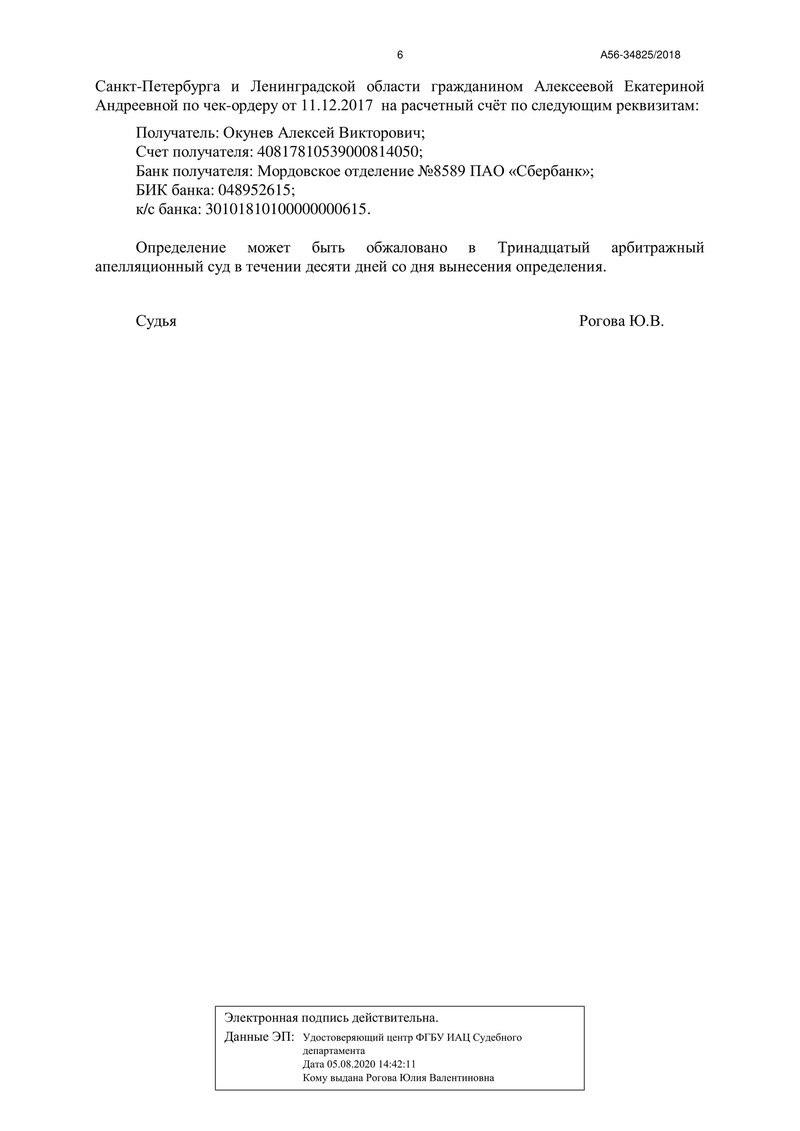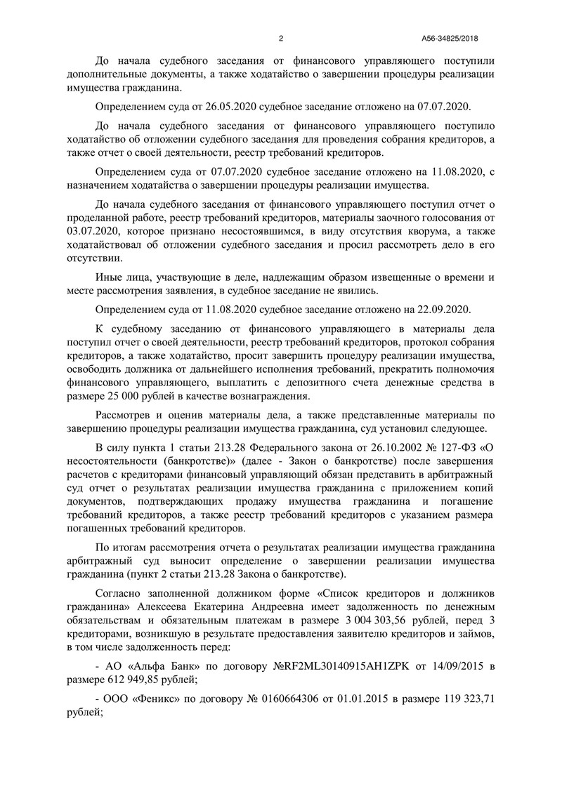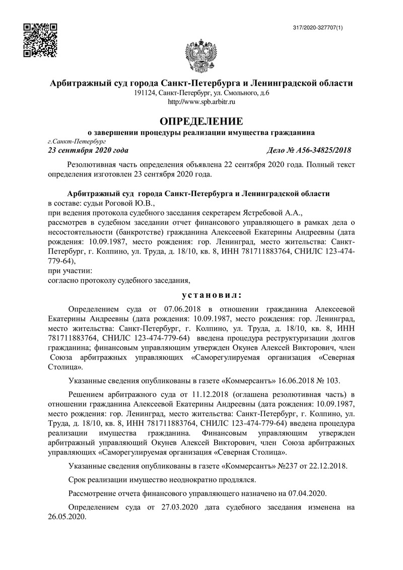 23 сентября 2020 года Арбитражный суд города Санкт-Петербурга и Ленинградской области вынес определение о завершении процедуры реализации имущества гражданина.