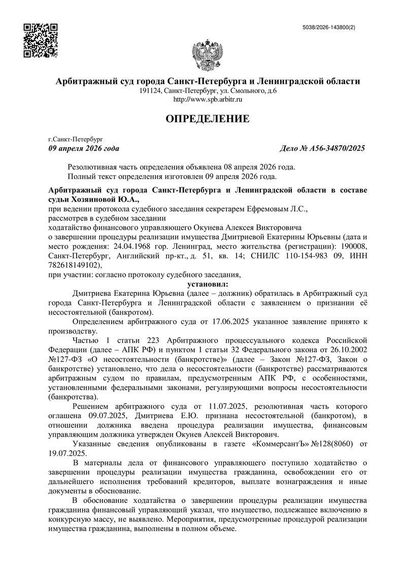 Еще одна процедура банкротства успешно завершилась в Арбитражном суде города Санкт-Петербурга и Ленинградской области при сопровождении специалистов компании "ДОЛГАМ.НЕТ". Судебный акт по делу №А56-34870/2025 наглядно показывает, как этот механизм помогает человеку поставить точку в затянувшихся финансовых обязательствах и начать жизнь без постоянного давления кредиторов.