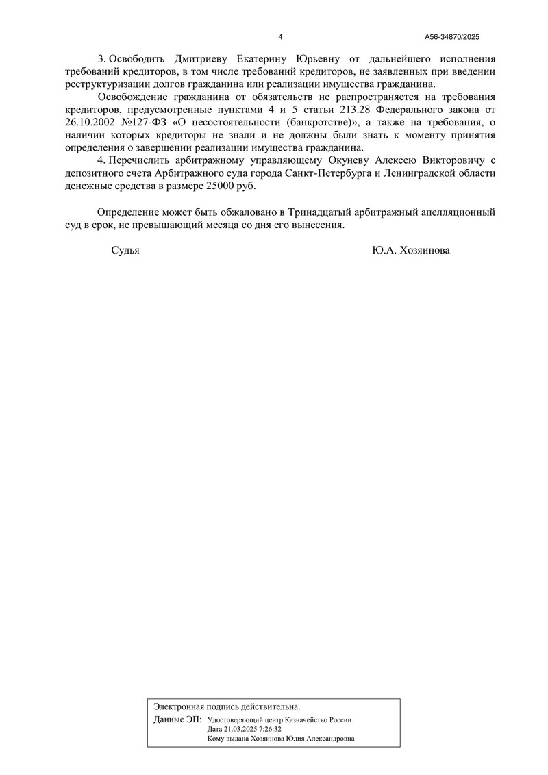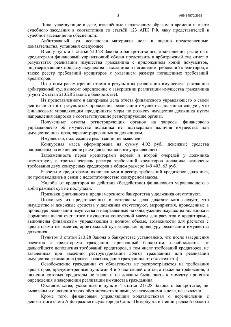 Так как конкурсной массы оказалось недостаточно, расчеты с кредиторами не производились. Однако при отсутствии нарушений закон позволяет списать оставшиеся обязательства. Суд отдельно отметил, что жалоб на действия (бездействие) финансового управляющего не поступало и что признаки фиктивного или преднамеренного банкротства отсутствуют.