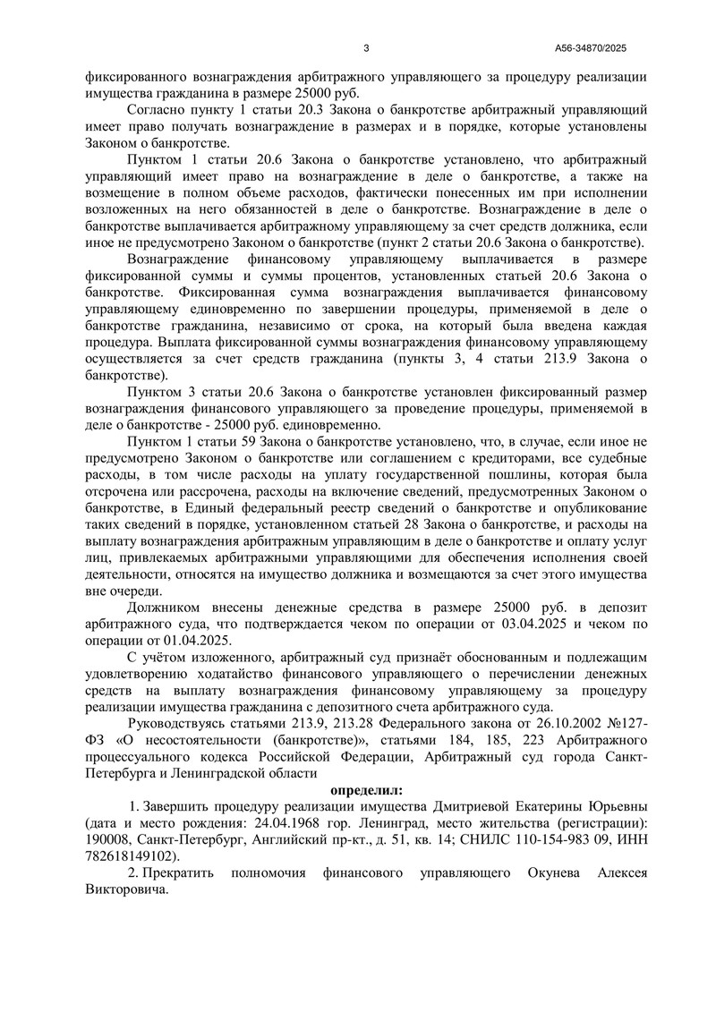 - перечислить финансовому управляющему вознаграждение в размере 25 000 руб. с депозитного счета суда.