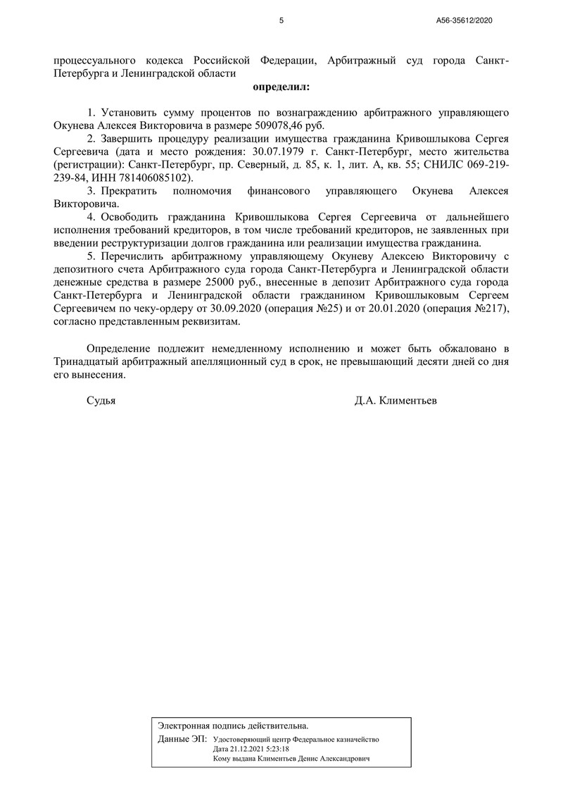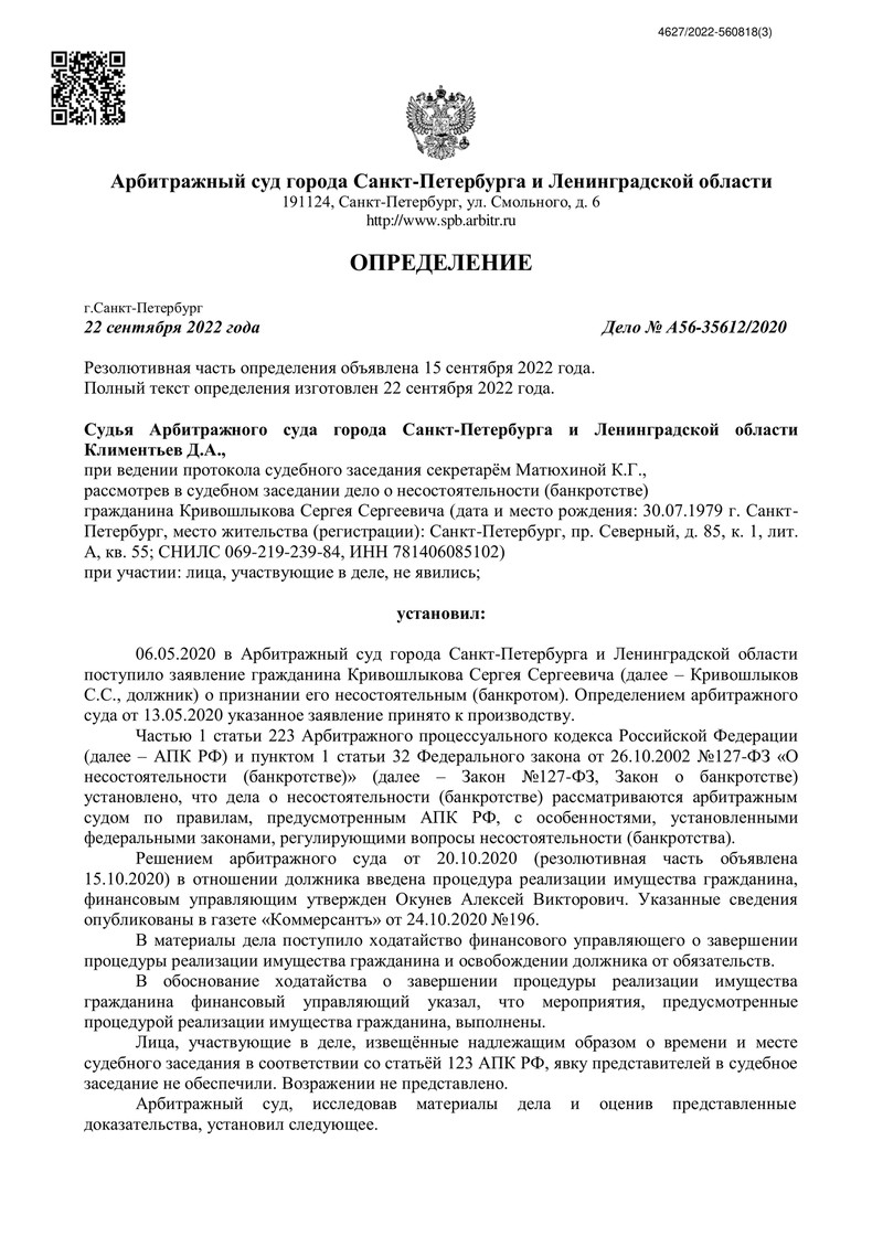 22 сентября 2022 года арбитражный суд завершил процедуру реализации имущества и освободил должника от дальнейшего исполнения долговых обязательств.