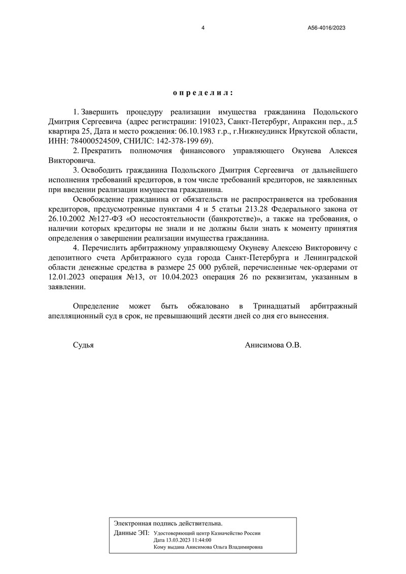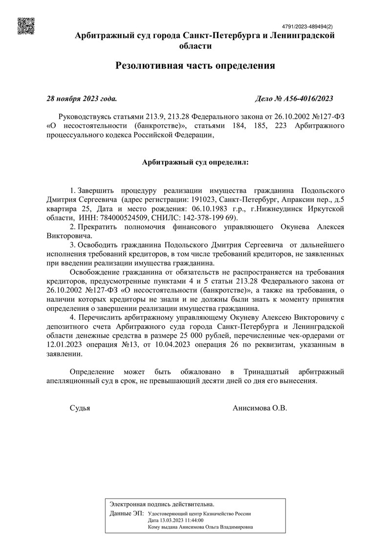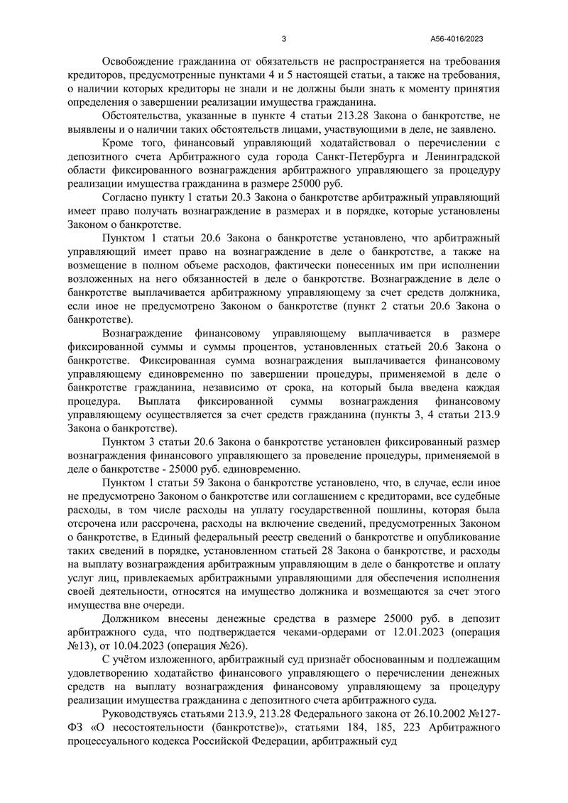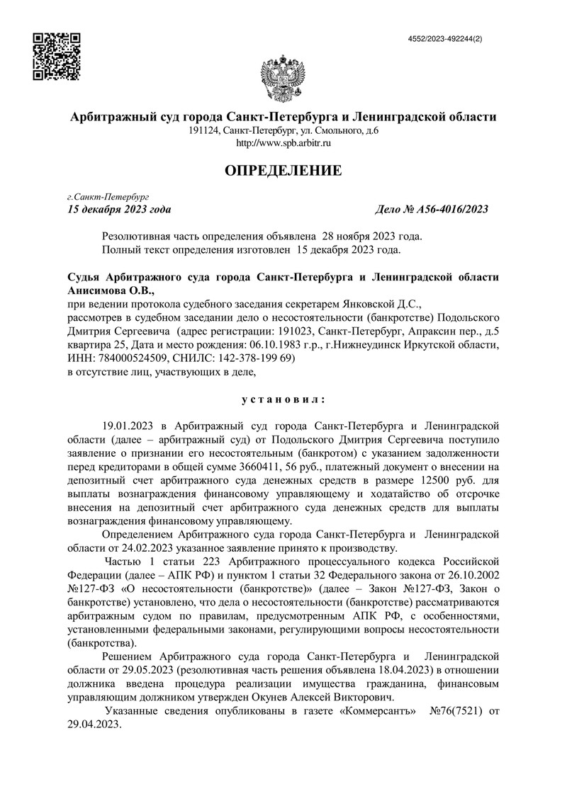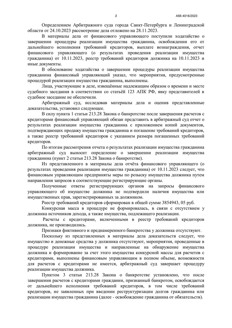 Очередной счастливый клиент компании "ДОЛГАМ.НЕТ" может радоваться новому этапу своей жизни. Арбитражный суд города Санкт-Петербурга и Ленинградской области завершил процедуру банкротства, которая освободила его от долгов. Дело №А56-4016/2023 стало примером успешной работы нашей компании.