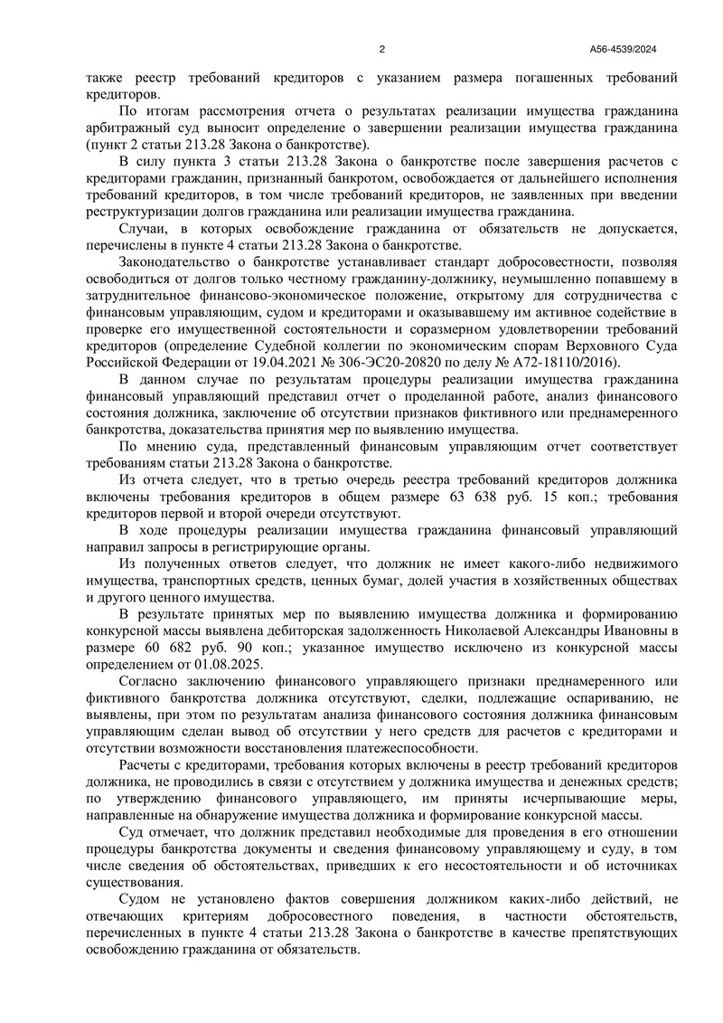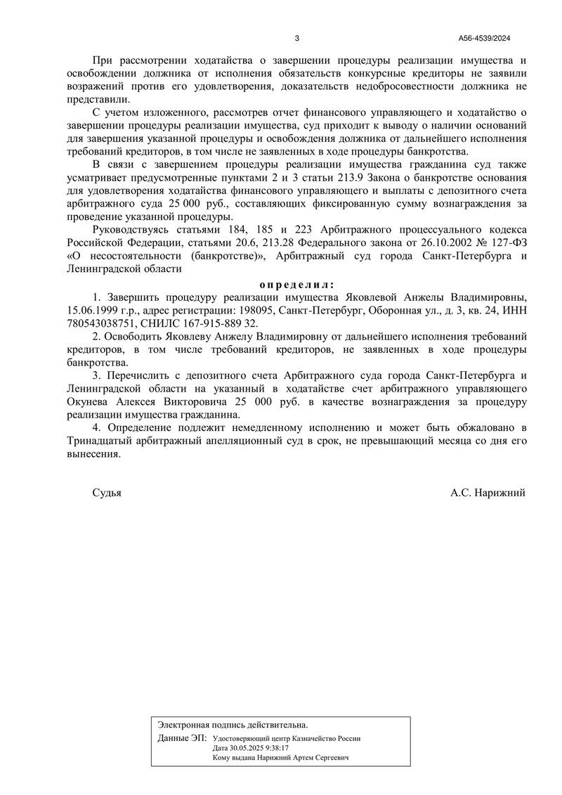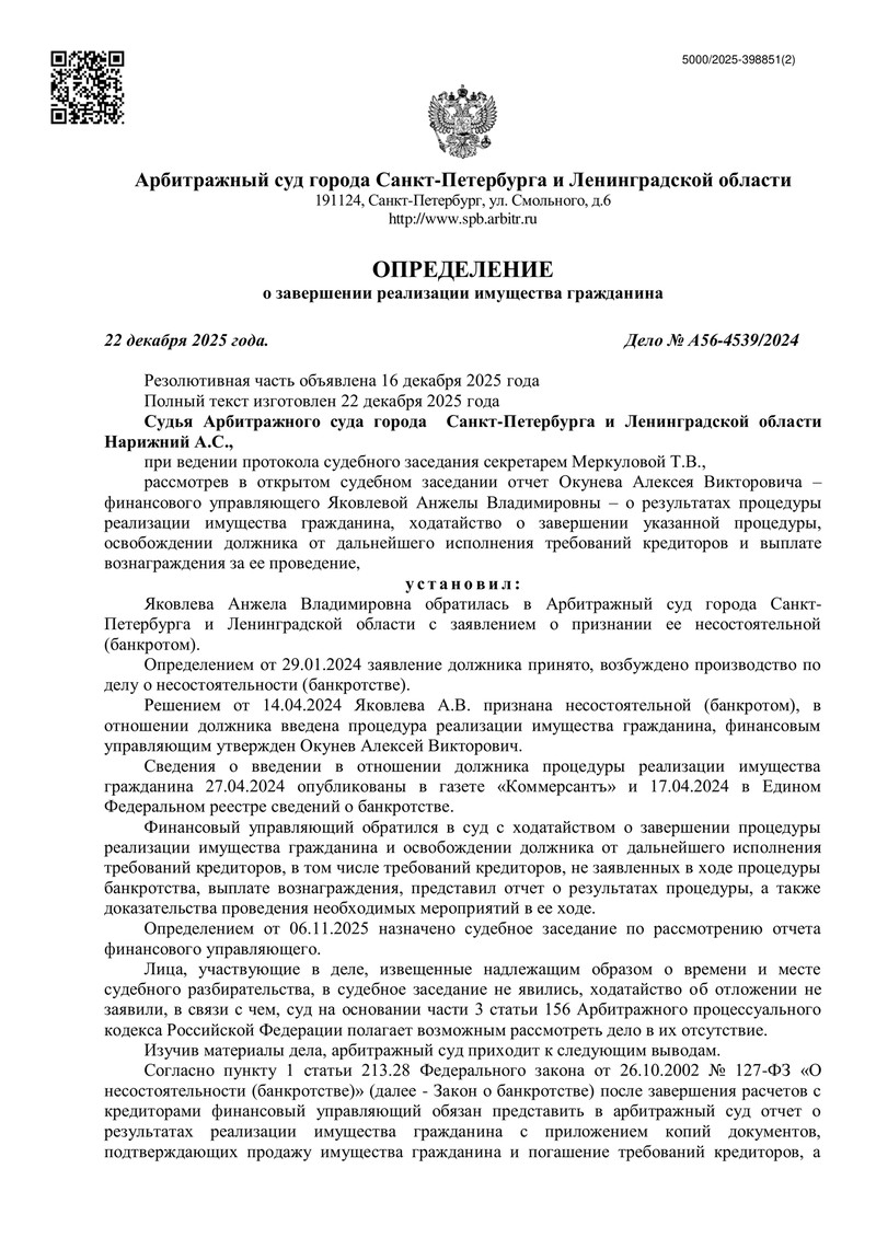 Еще одно завершенное дело №А56-4539/2024 в копилке команды "ДОЛГАМ.НЕТ". Арбитражный суд города Санкт‑Петербурга и Ленинградской области завершил процедуру реализации имущества гражданина и освободил должника от дальнейшего исполнения требований кредиторов. Определение вынесено 22 декабря 2025 года, резолютивная часть объявлена 16.12.2025.