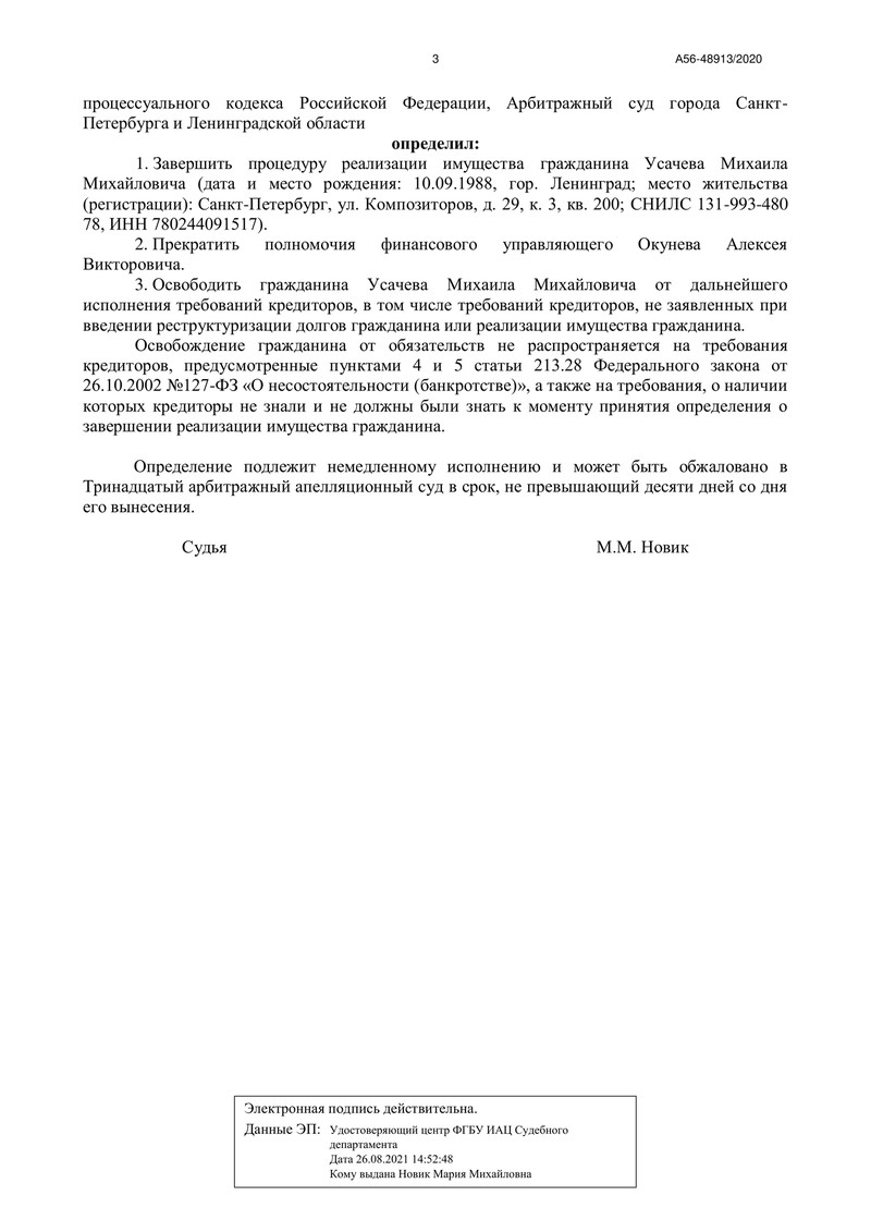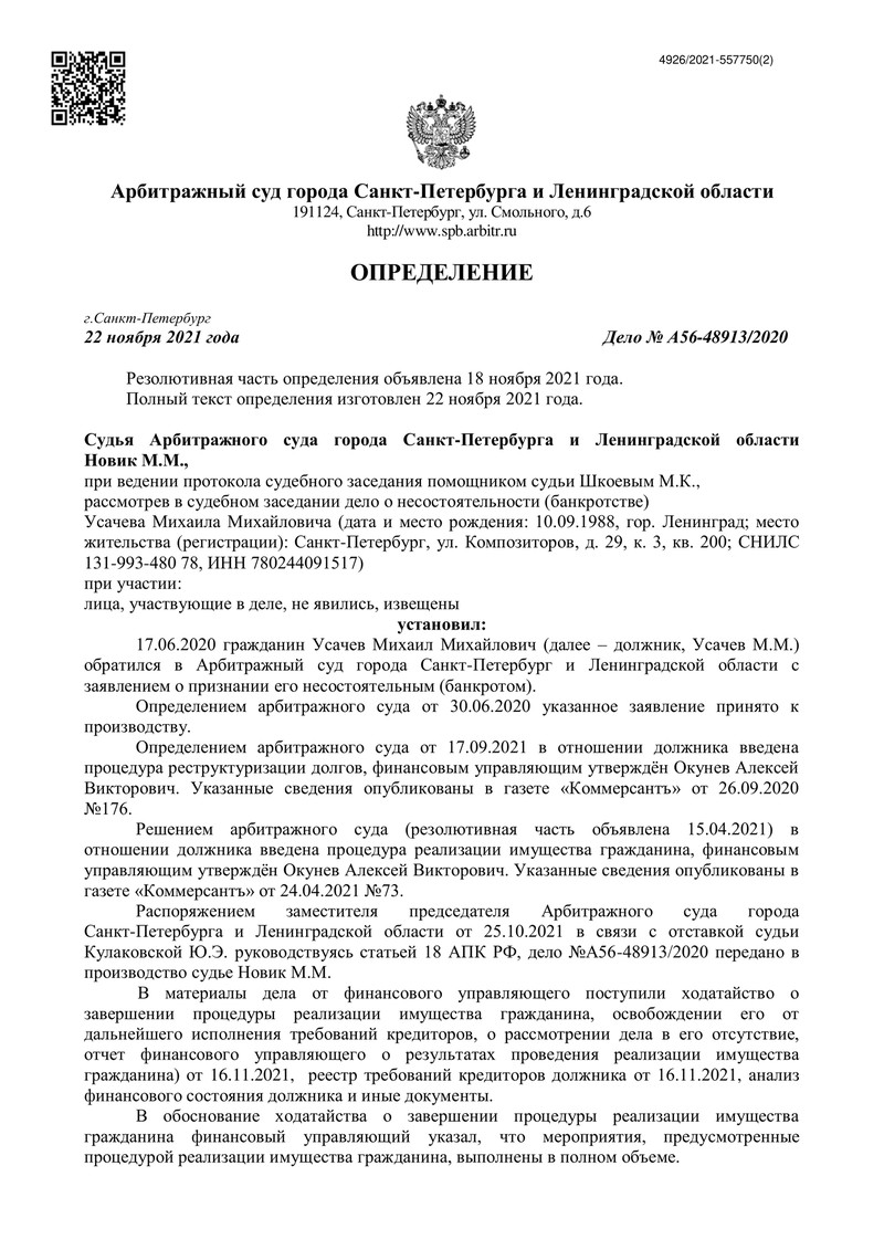 22 ноября 2021 года Арбитражный суд Санкт-Петербурга и Ленинградской области вынес определение о завершении процедуры реализации имущества гражданина и освобождении его от дальнейшего исполнения требований кредиторов. Полномочия финансового управляющего были прекращены.