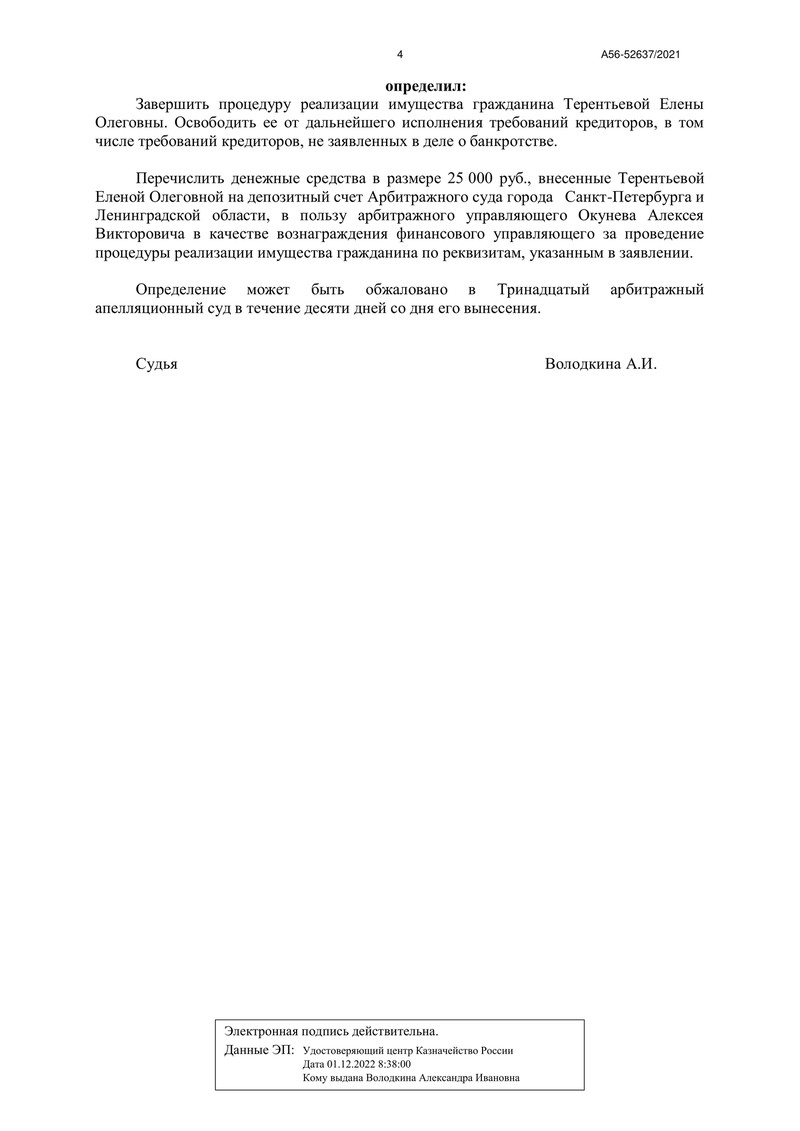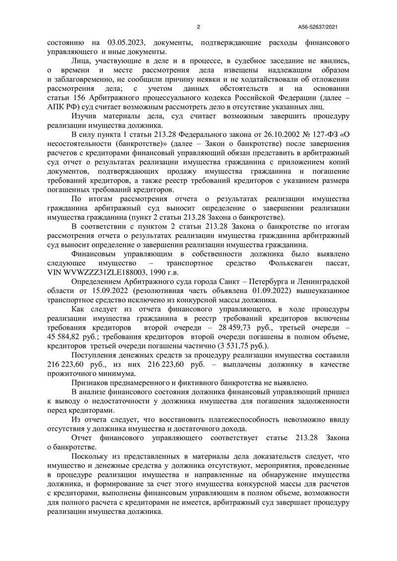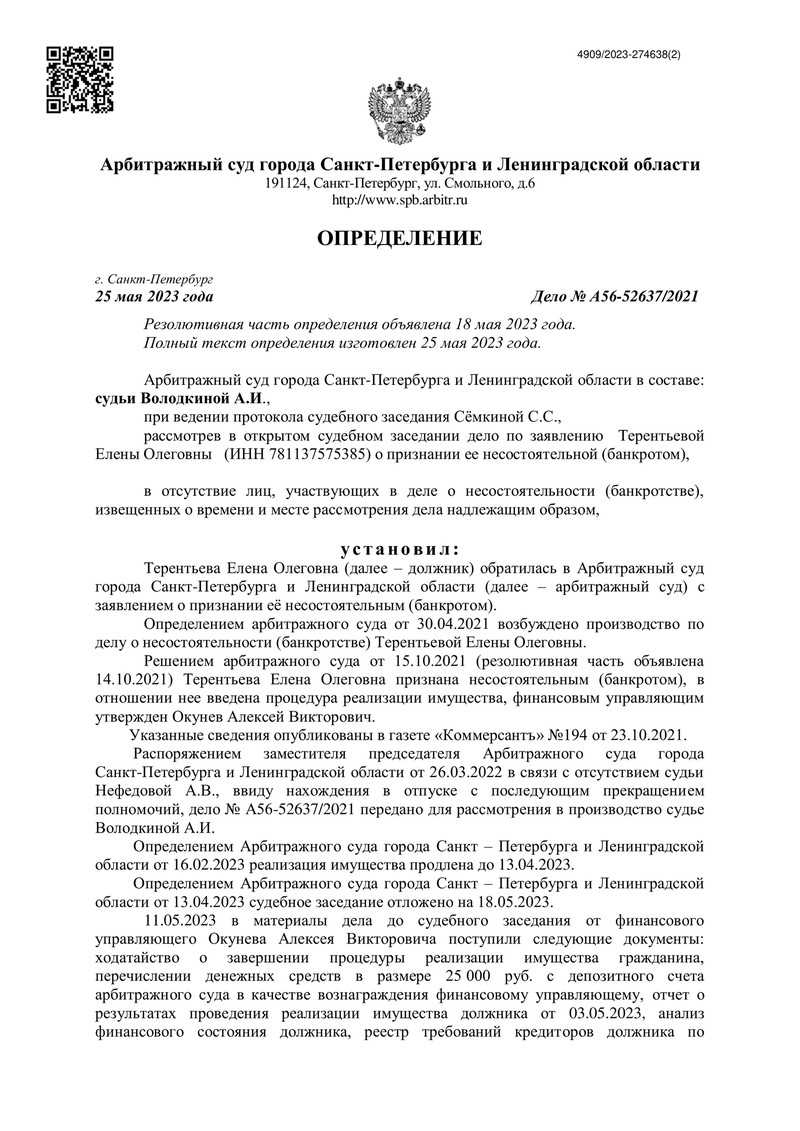 25 мая 2023 года арбитражный суд принял решение завершить процедуру реализации имущества и освободить нашего клиента от дальнейшего исполнения требований кредиторов.