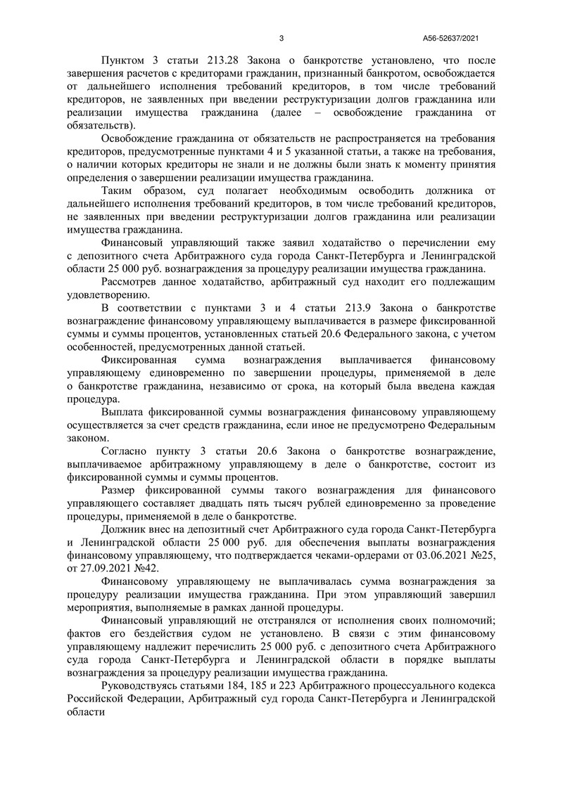 Компания "ДОЛГАМ.НЕТ" с гордостью сообщает об очередном успехе! Дело №А56-52637/2021 завершилось в Арбитражном суде города Санкт-Петербурга и Ленинградской области полным освобождением нашего клиента от долговых обязательств. Этот результат стал возможным благодаря профессионализму нашей команды.