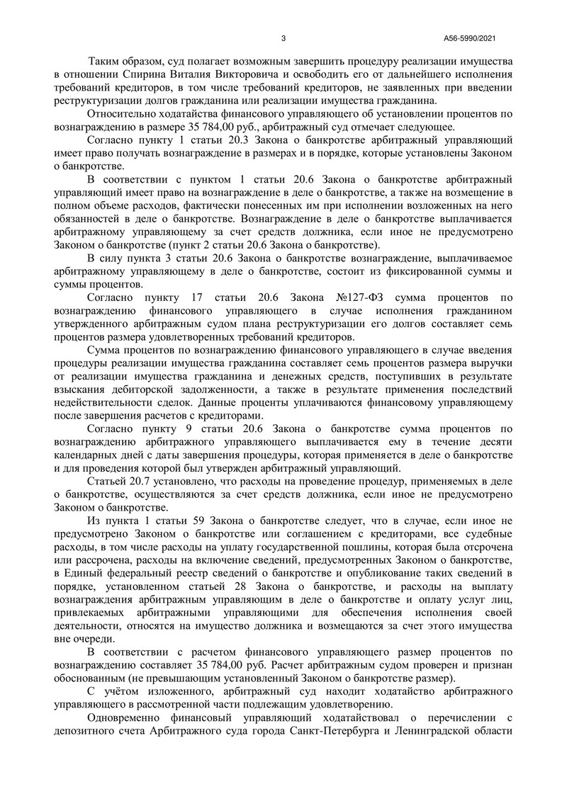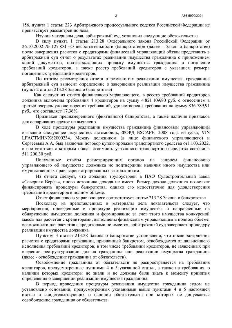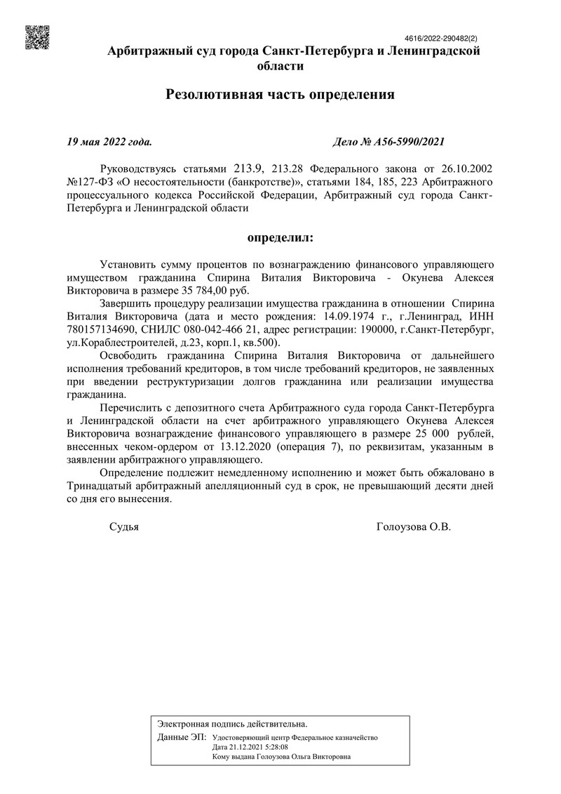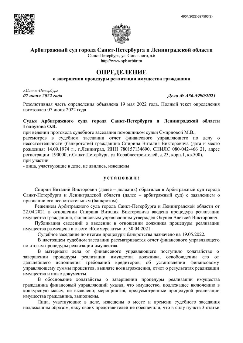 Компания "ДОЛГАМ.НЕТ" продолжает помогать своим клиентам избавиться от долгового бремени, и сегодня мы хотим поделиться с Вами новой историей. 19 мая 2022 года Арбитражный суд города Санкт-Петербурга и Ленинградской области завершил процедуру реализации имущества в отношении нашего клиента по делу №А56-5990/2021.