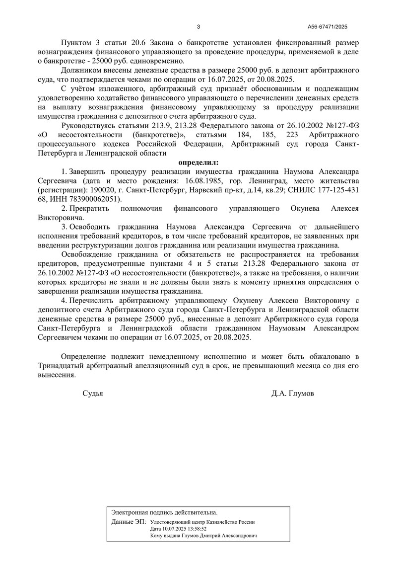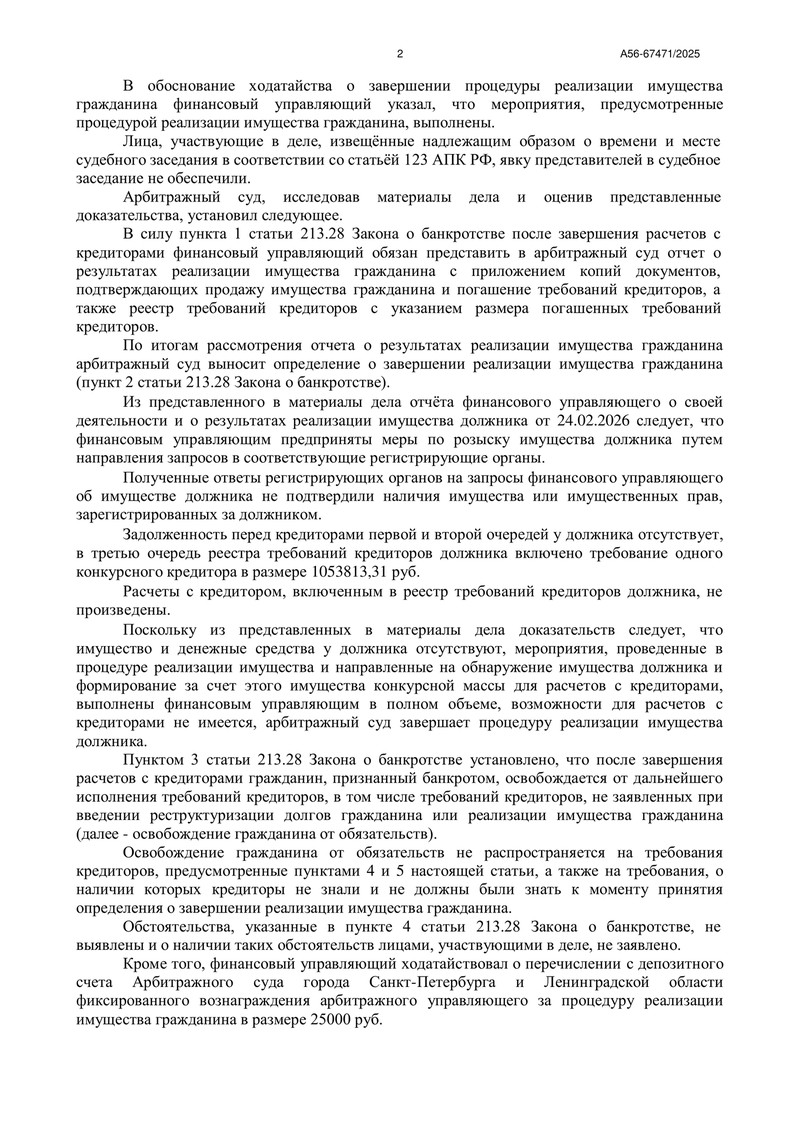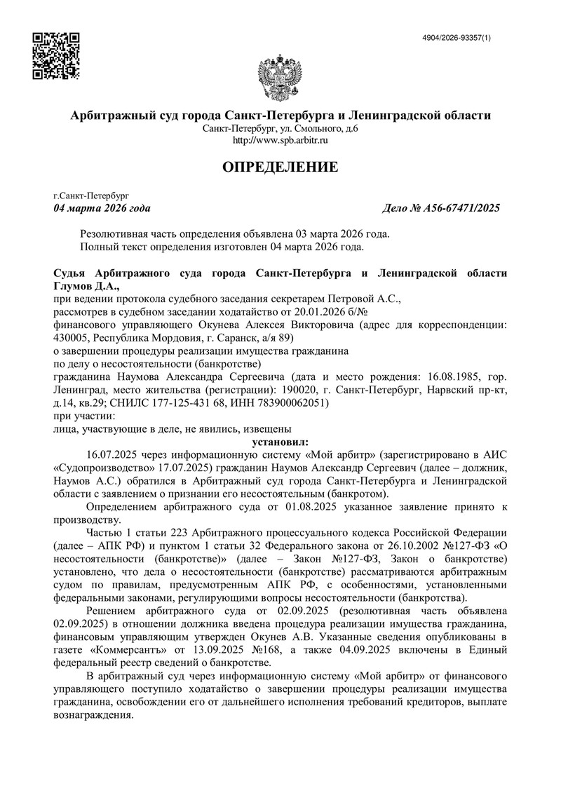 03 марта 2026 года Арбитражный суд города Санкт‑Петербурга и Ленинградской области вынес судебный акт, который подвел итог процедуры банкротства гражданина и определил освободить нашего клиента от дальнейшего исполнения требований кредиторов.