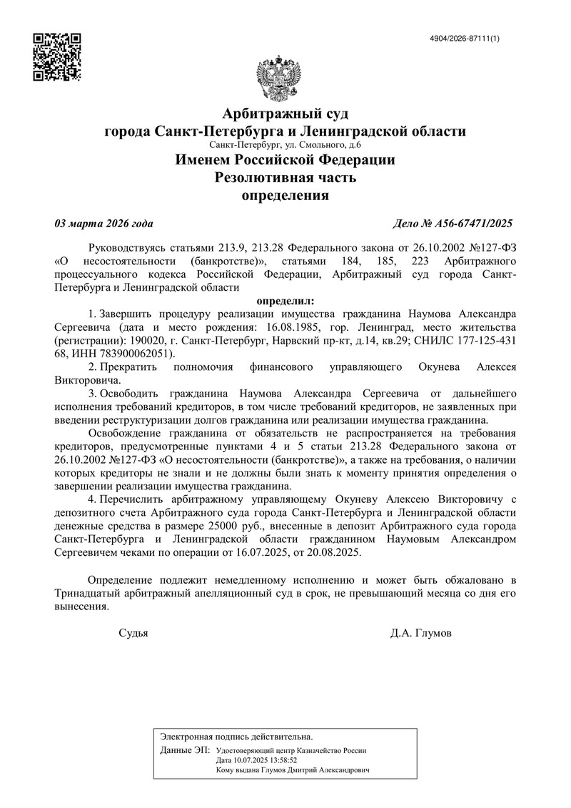 Дело № А56-67471/2025, Санкт‑Петербург: процедура банкротства завершена, клиент освобожден от долгов