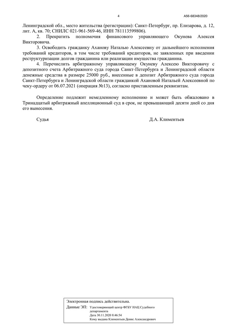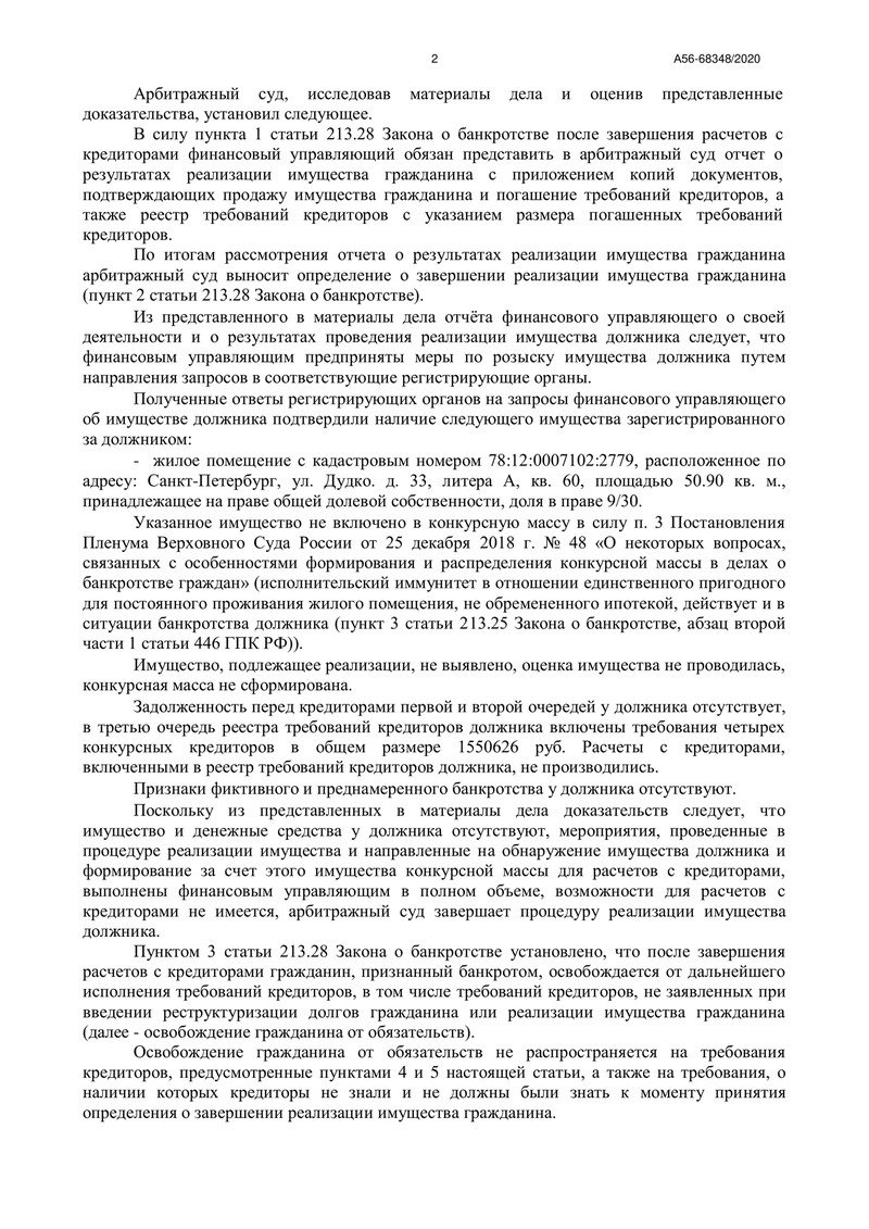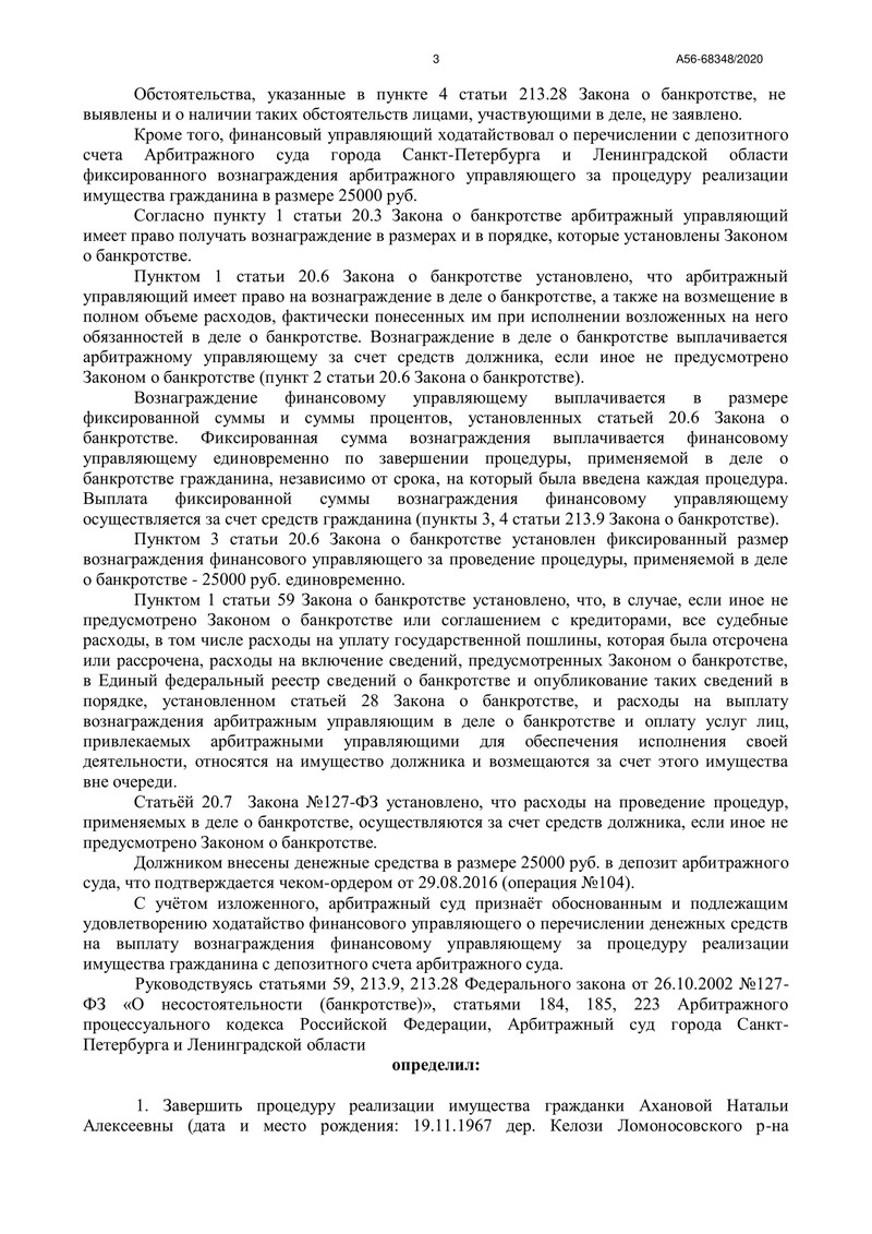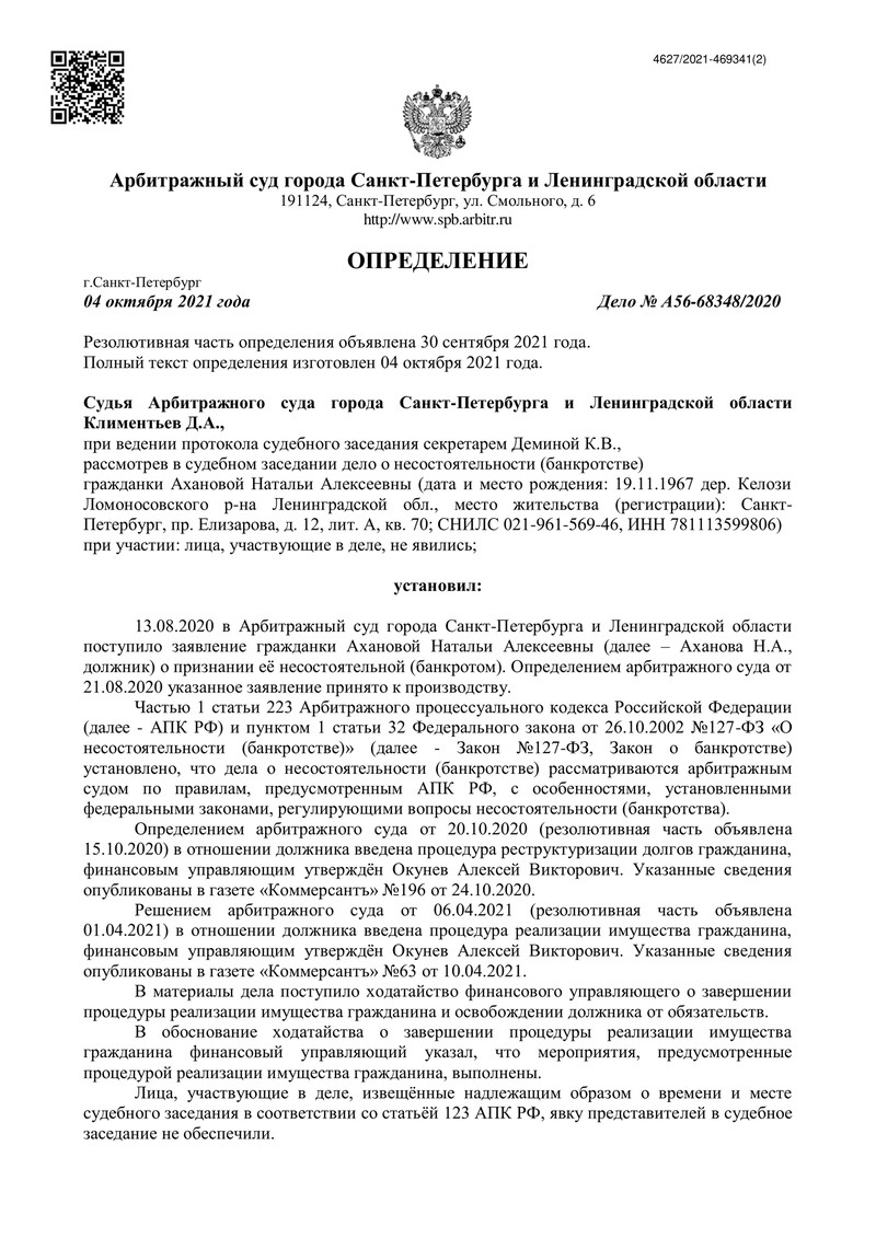 Арбитражный суд города Санкт-Петербурга и Ленинградской области вынес определение по делу №А56-68348/2020, завершив процедуру реализации имущества должника, обратившегося за помощью в компанию "ДОЛГАМ.НЕТ". Еще один наш клиент получил возможность начать финансовую жизнь с чистого листа.
