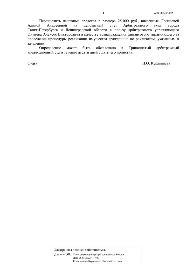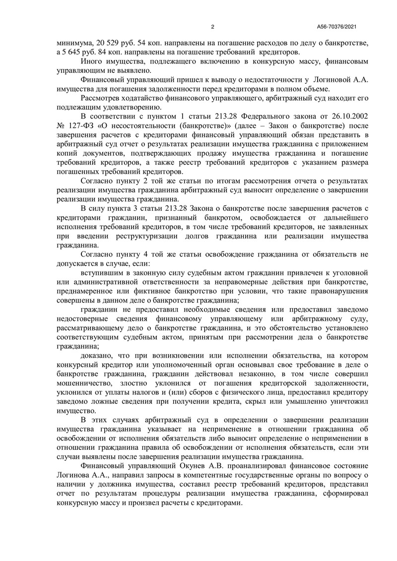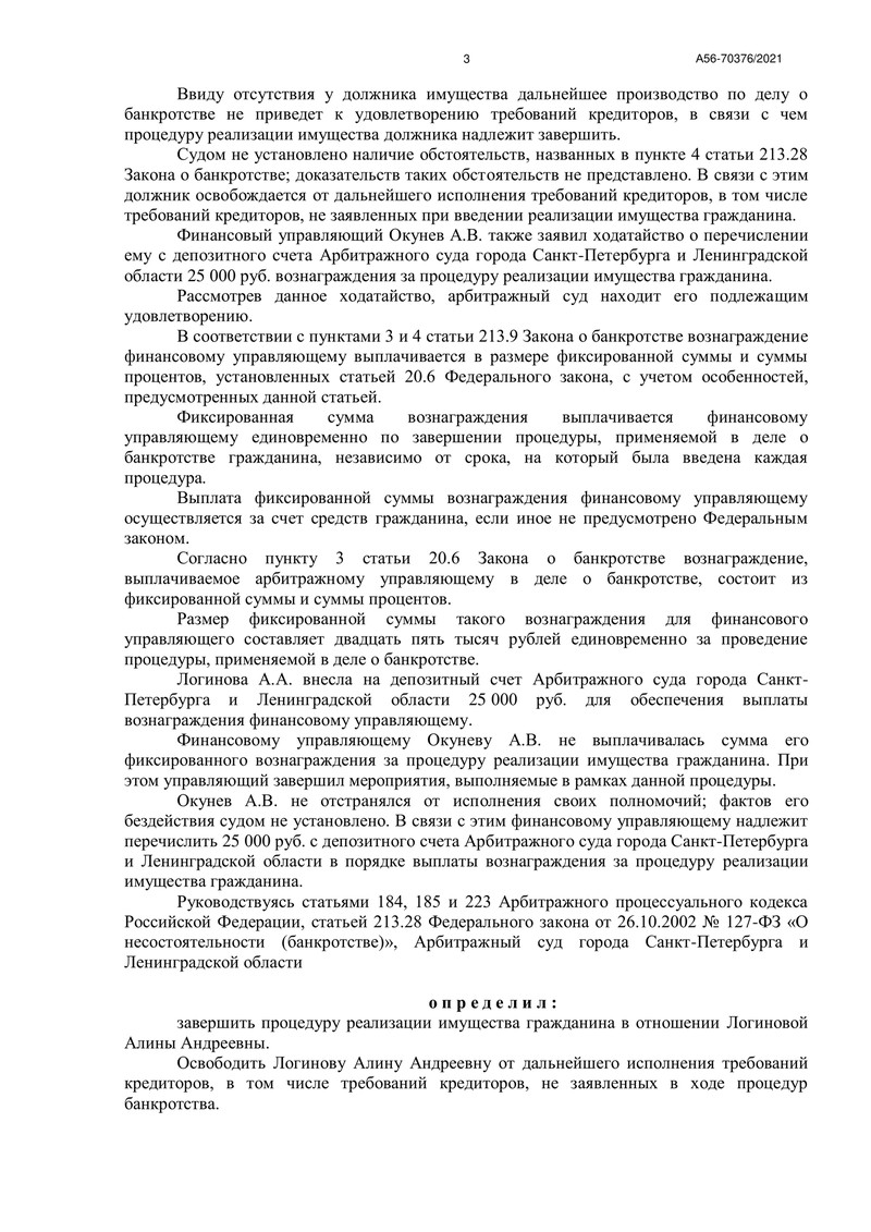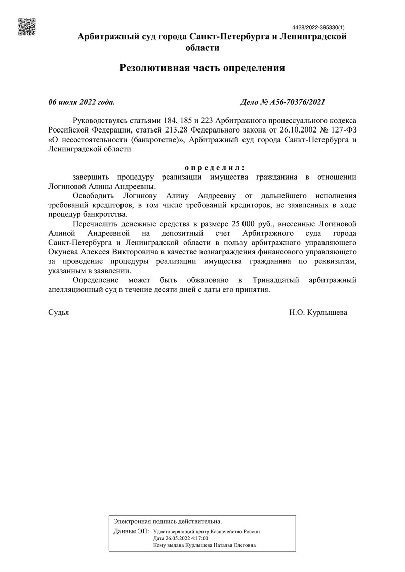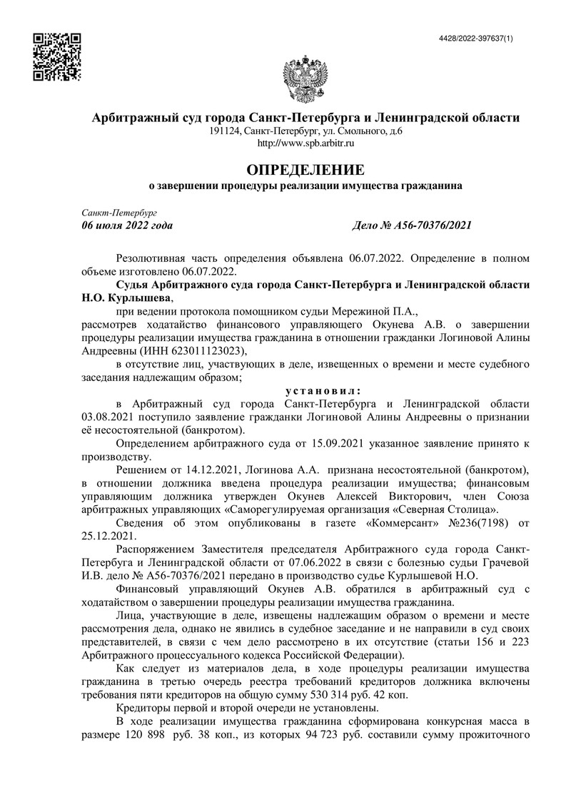 06 июля 2022 года Арбитражный суд города Санкт-Петербурга и Ленинградской области завершил очередное дело о банкротстве клиента компании "ДОЛГАМ.НЕТ". Это было дело № А56-70376/2021.