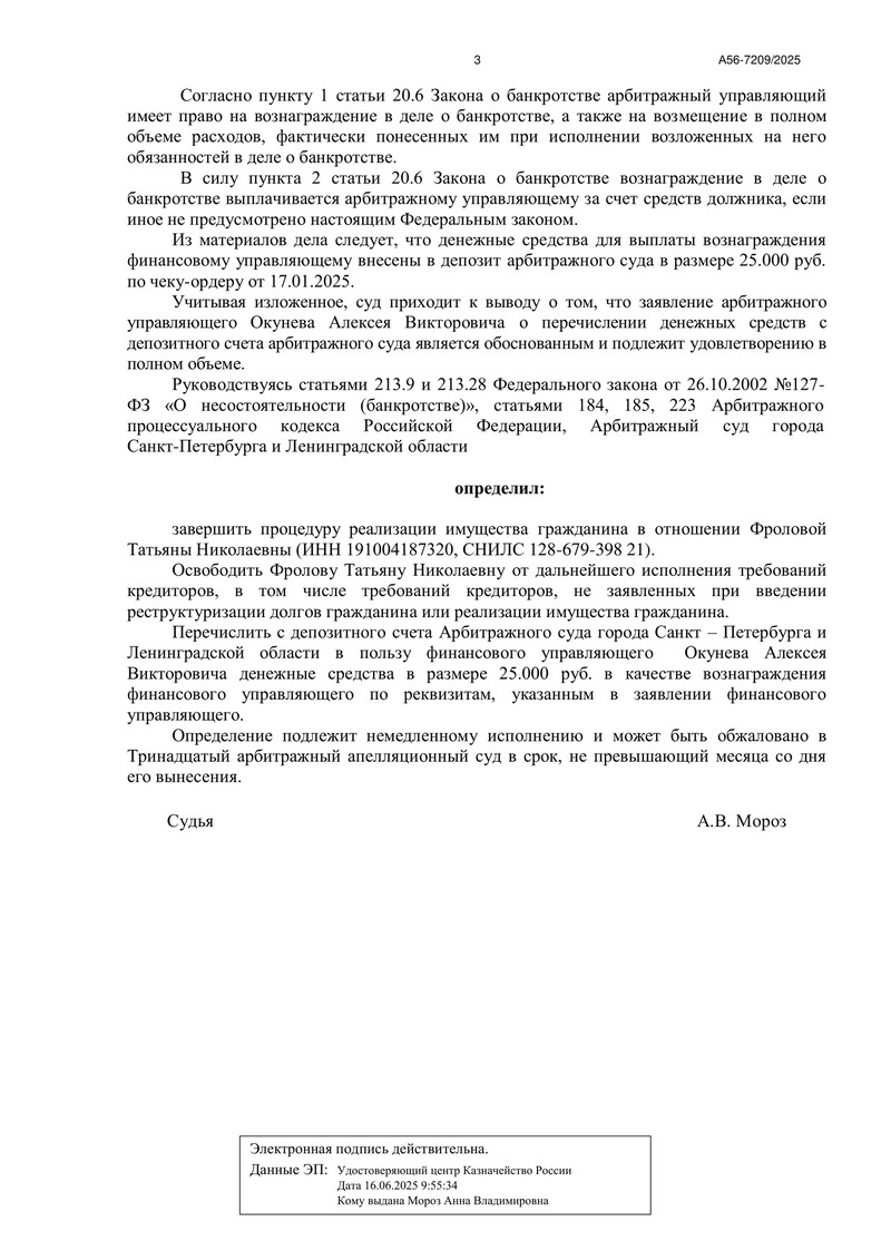Дополнительно суд определил перечислить финансовому управляющему вознаграждение 25 000 руб. с депозита суда, что является стандартной и обязательной частью процедуры.