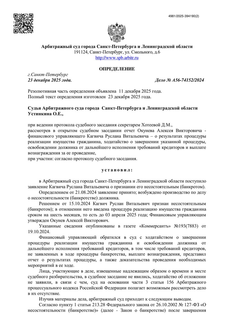 - 11.12.2025 была объявлена резолютивная часть, а 23.12.2025 изготовлен полный текст судебного акта, которым процедура завершена.