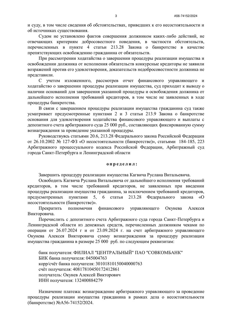 - 15.10.2024 суд решением признал гражданина несостоятельным (банкротом) и ввел процедуру реализации имущества сроком на шесть месяцев (до 03.04.2025). Финансовым управляющим был утвержден Окунев А.В.
