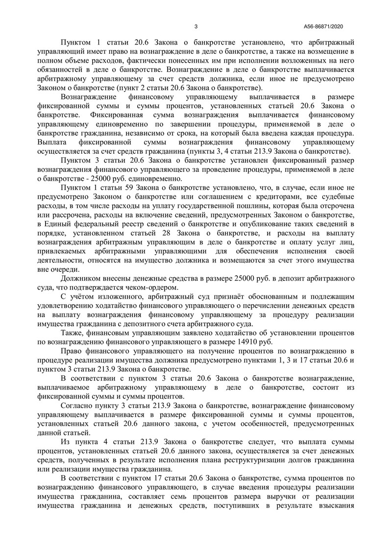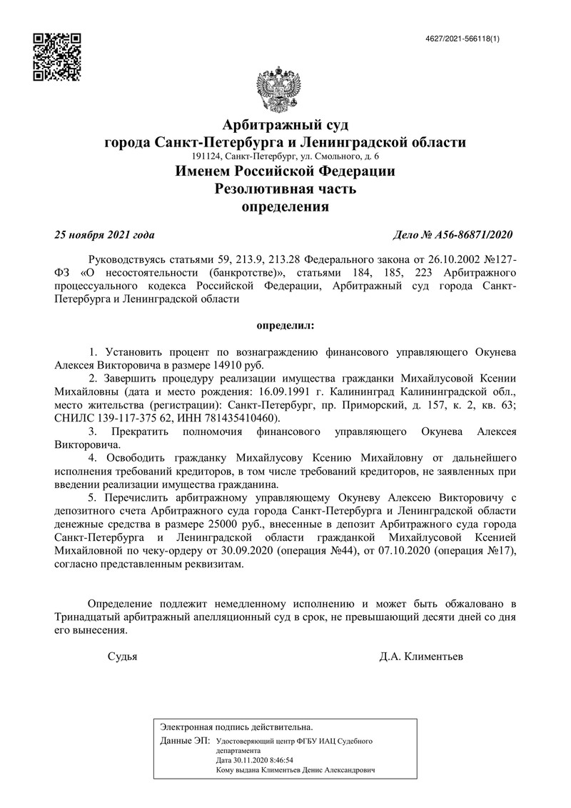 Согласно отчету финансового управляющего долги перед кредиторами первой и второй очередей отсутствовали, а общий размер требований кредиторов третьей очереди составил 2 855 470 руб. Из этой суммы удалось удовлетворить 7,68% требований - было выплачено 219 067 руб. Это позволяет считать процедуру завершенной, и суд подтвердил это, освободив наш клиента от дальнейшего исполнения обязательств.