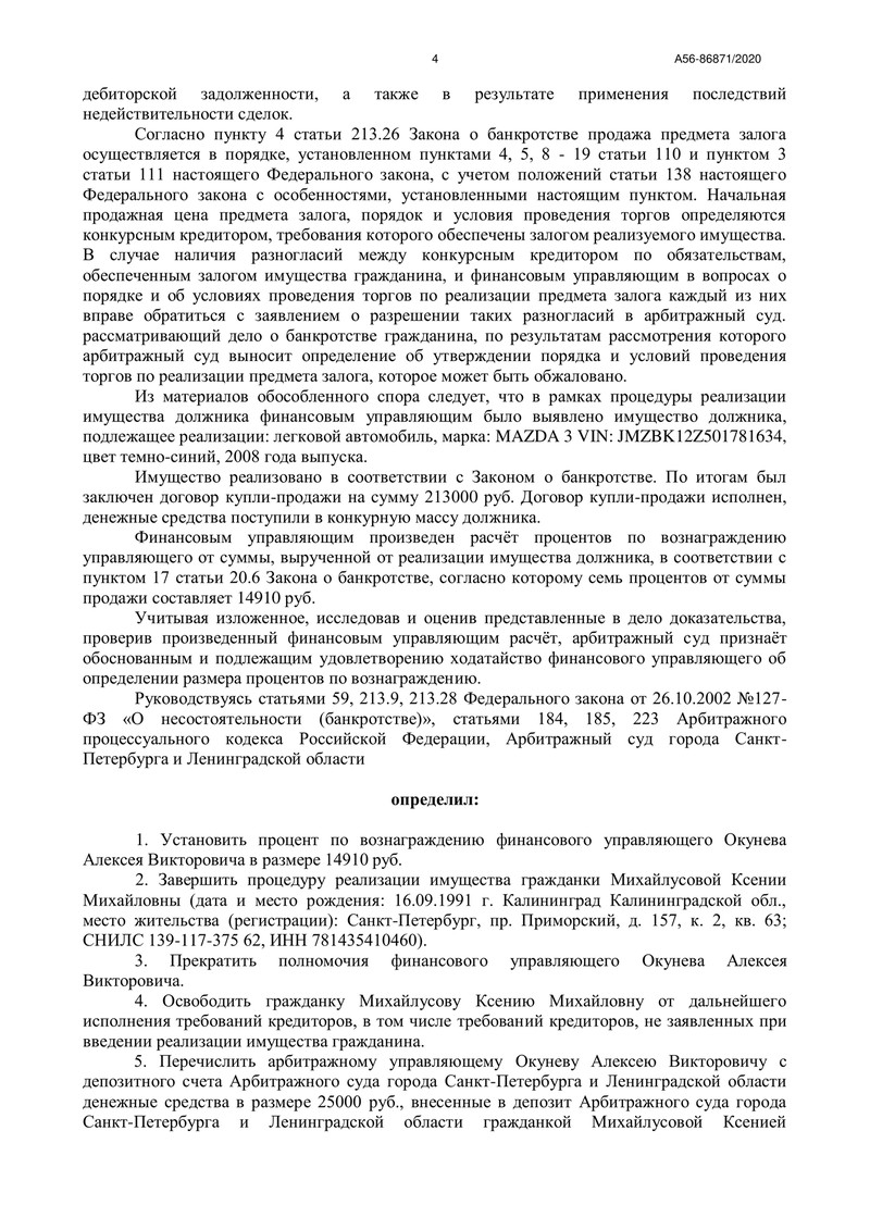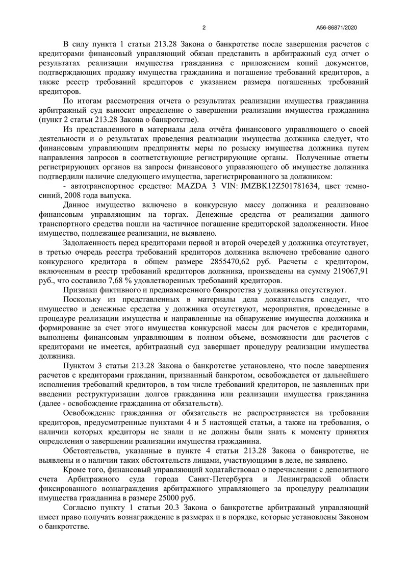 Финансовый управляющий провёл все необходимые мероприятия, предусмотренные Законом о банкротстве, и обнаружил легковой автомобиль MAZDA 3. Этот автомобиль был продан на торгах, и денежные средства от продажи частично покрыли задолженности перед кредиторами.