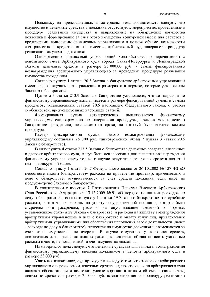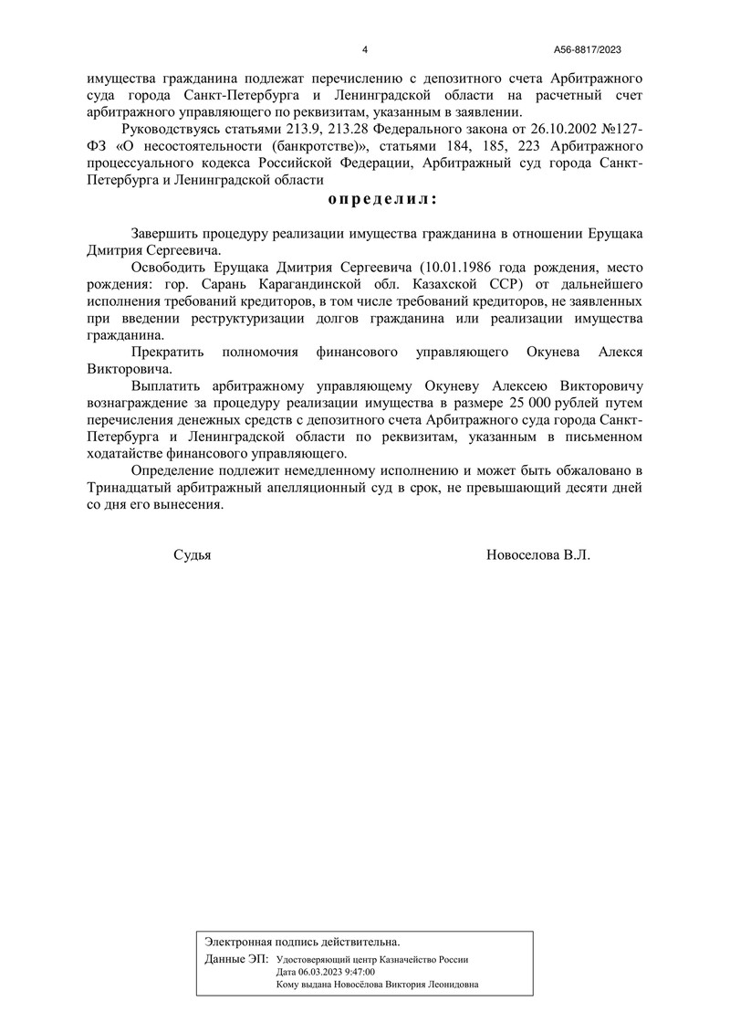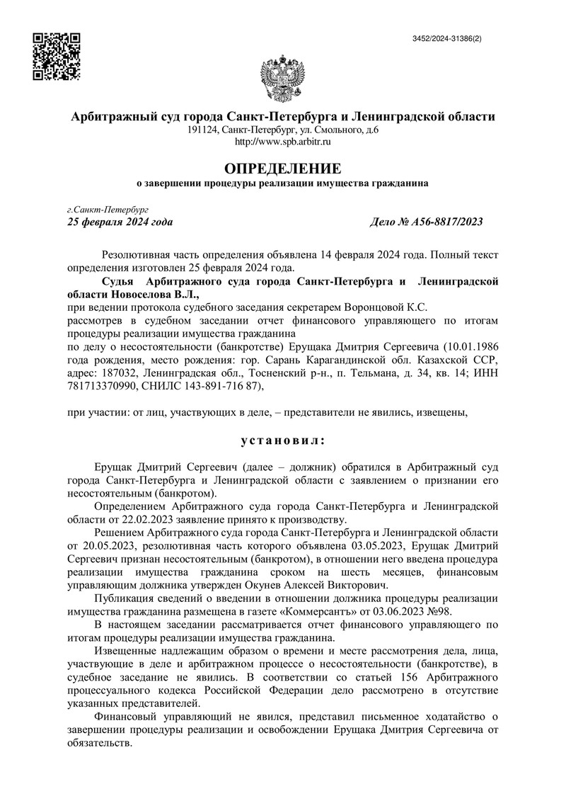 Очередной клиент "ДОЛГАМ.НЕТ" получил финансовую свободу благодаря успешному завершению процедуры банкротства. Арбитражный суд города Санкт-Петербурга и Ленинградской области 25 февраля 2024 года вынес определение о завершении процедуры реализации имущества гражданина.