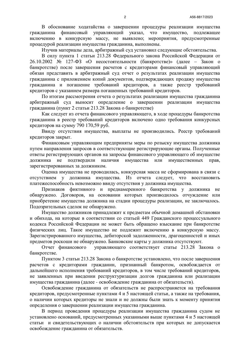 На основании анализа предоставленных документов арбитражный суд принял решение об освобождении нашего клиента от дальнейшего исполнения требований кредиторов. Процедура завершилась успешно, и полномочия финансового управляющего были прекращены.