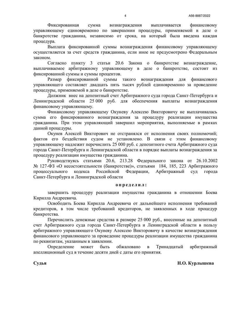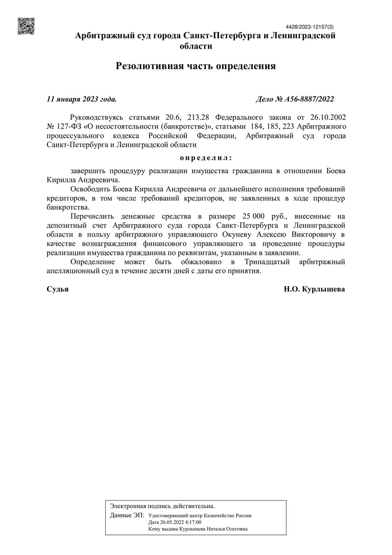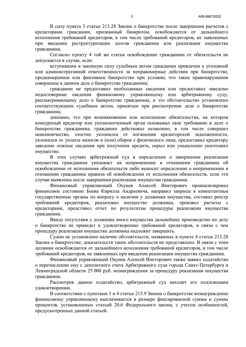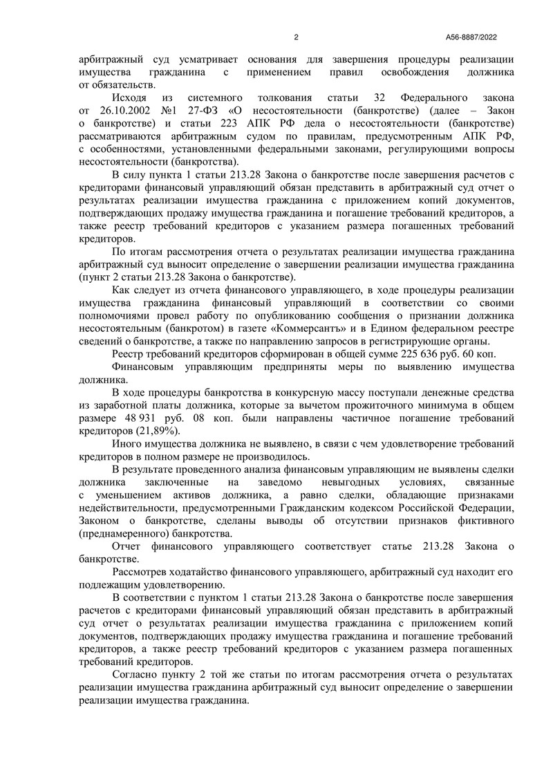 Новая история нашего успеха! Арбитражный суд города Санкт-Петербурга и Ленинградской области завершил процедуру реализации имущества нашего клиента и освободил его от дальнейшего исполнения требований кредиторов! 11 января 2023 года суд вынес по делу №А56-8887/2022 положительное решение в пользу клиента нашей компании, что еще раз подтвердило высокий профессионализм команды "ДОЛГАМ.НЕТ".