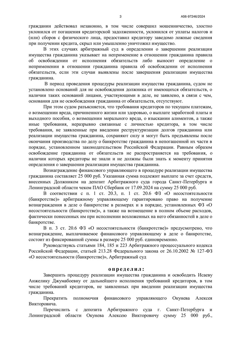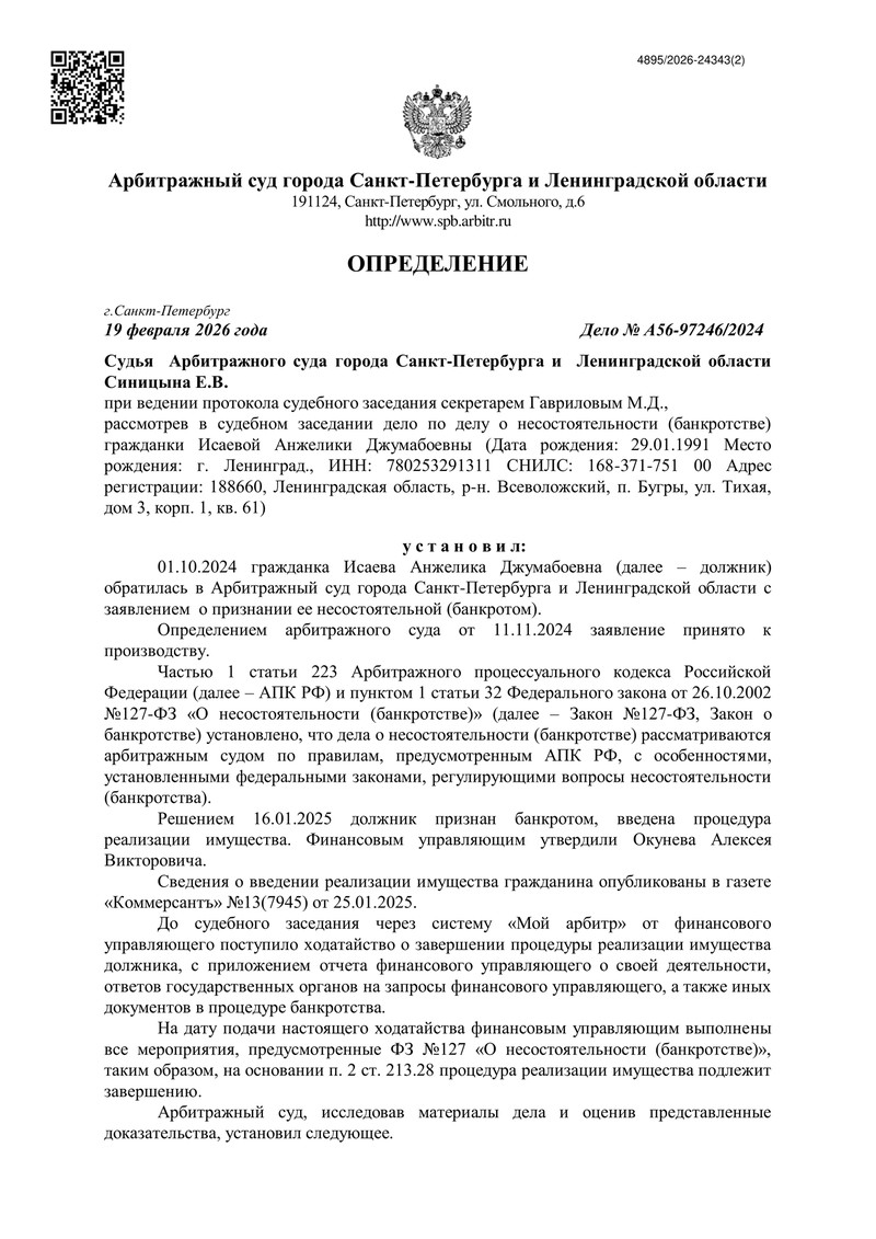 19 февраля 2026 года Арбитражный суд города Санкт‑Петербурга и Ленинградской области завершил процедуру реализации имущества и освободил гражданина от дальнейшего исполнения требований кредиторов.