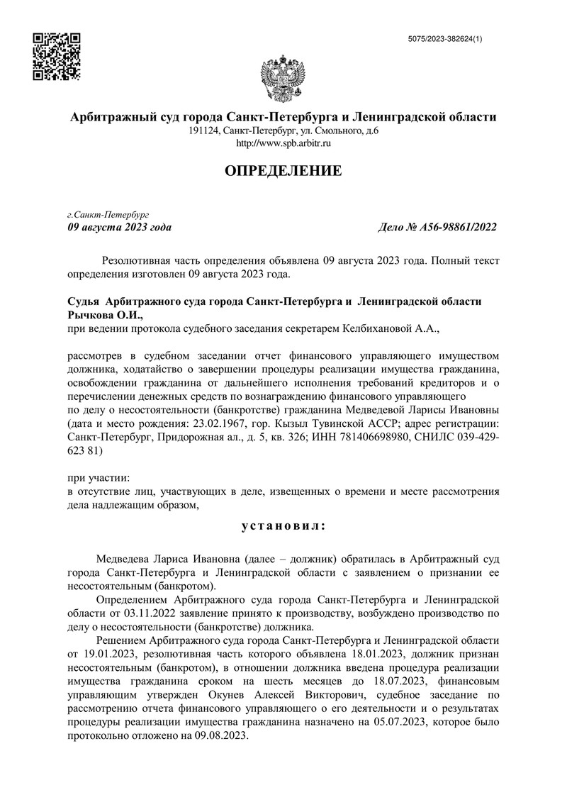 9 августа 2023 года суд завершил процедуру банкротства нашего клиента.