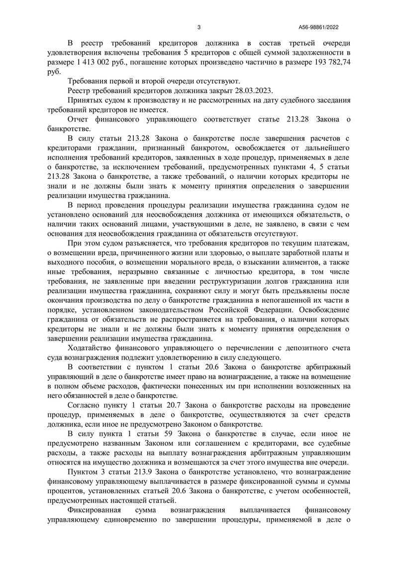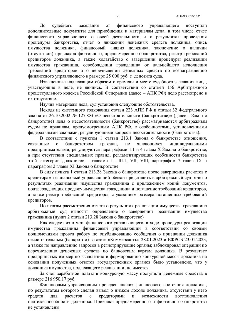 Решение о признании нашего клиента банкротом было принято 19 января 2023 года, и реализация имущества продолжалась до 18 июля 2023 года. Финансовый управляющий провел все необходимые мероприятия: