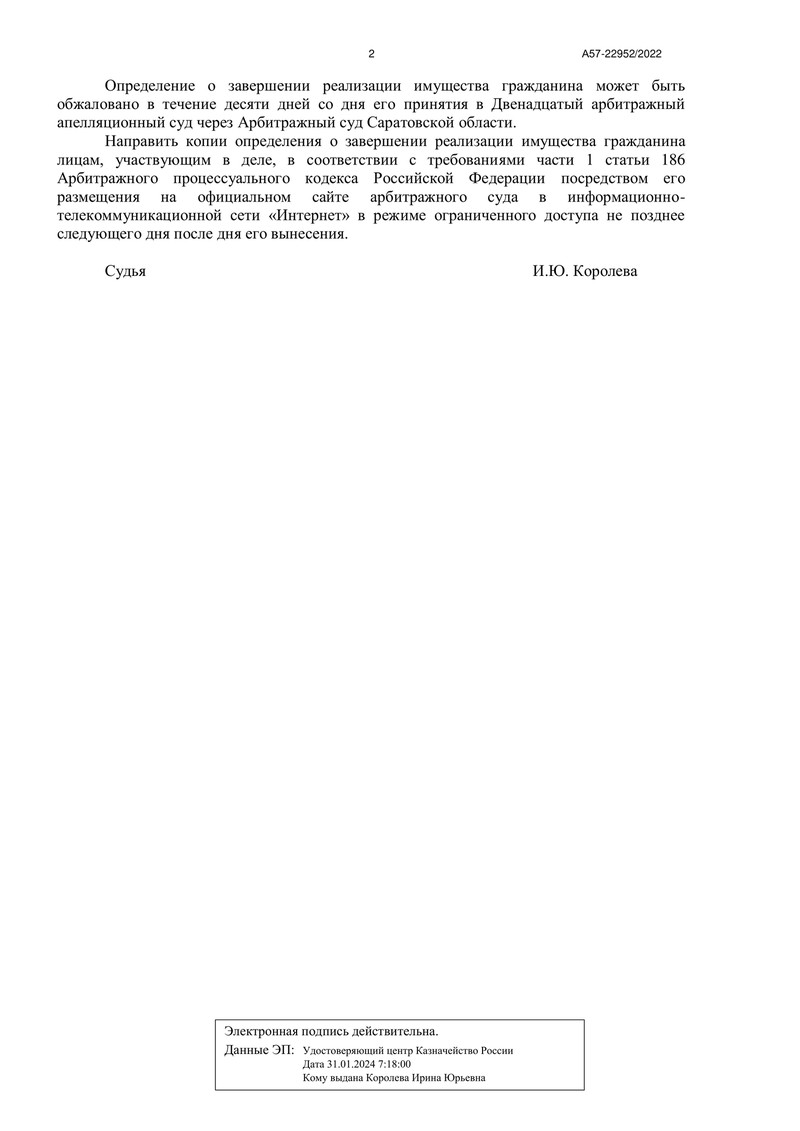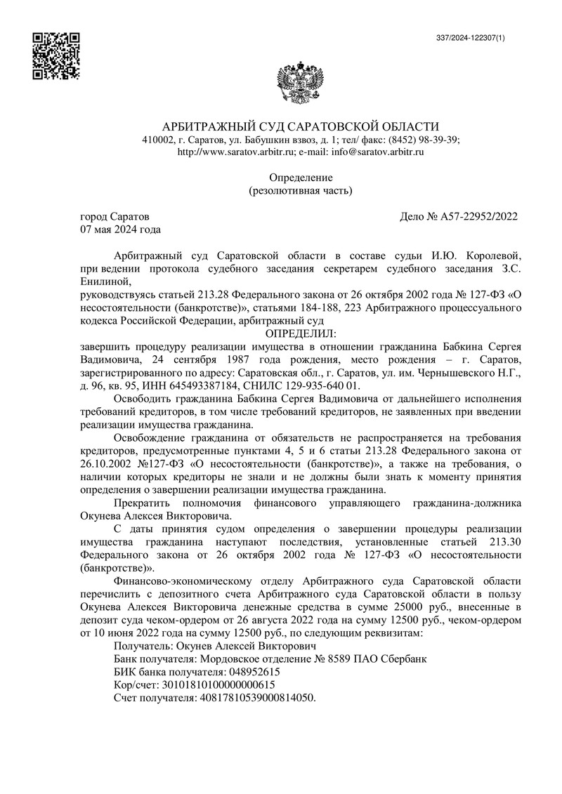 16 мая 2024 года Арбитражный суд Саратовской области завершил процедуру реализации имущества нашего клиента, прекратив все его долговые обязательства.