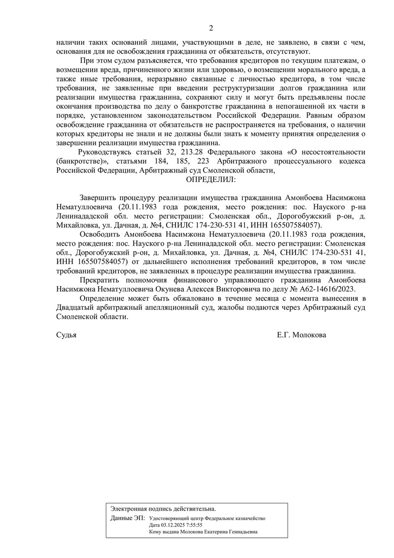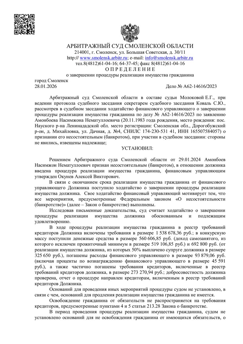 28.01.2026 Арбитражный суд Смоленской области вынес определение о завершении процедуры реализации имущества гражданина. Для нашего клиента это означает, что процедура пройдена до конца, а долги списаны в рамках закона.