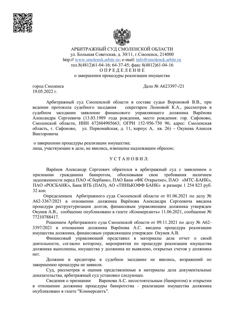 Еще один клиент компании "ДОЛГАМ.НЕТ" добился освобождения от долговых обязательств благодаря профессионализму наших юристов. Арбитражный суд Смоленской области завершил процедуру реализации имущества в деле №А62-3397/2021 и освободил должника от требований кредиторов.