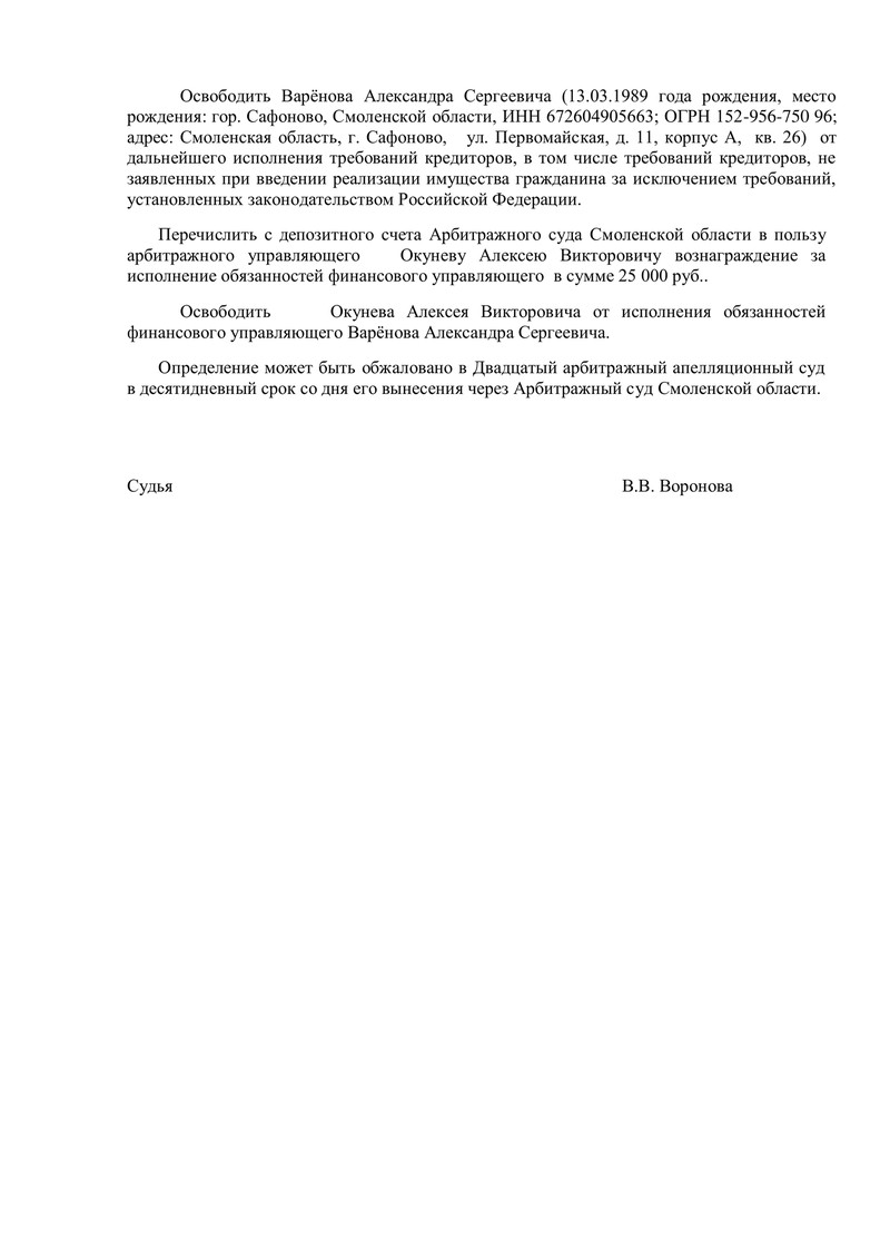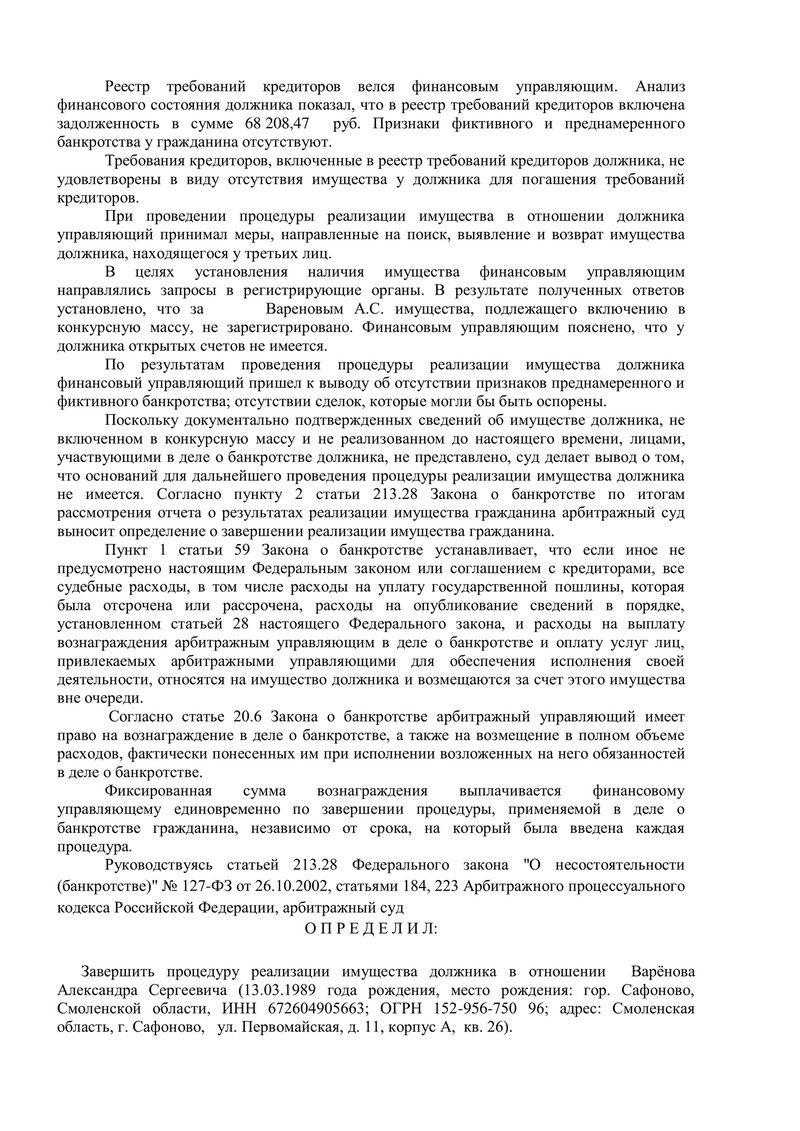 Финансовый управляющий проверил наличие у нашего клиента активов, но не нашел имущества или открытых счетов. Более того, не было выявлено признаков фиктивного или преднамеренного банкротства. В результате суд вынес определение о завершении процедуры.