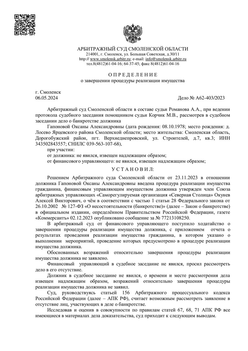 - Не выявлено имущества, не включенного в конкурсную массу или не реализованного на момент завершения процедуры.