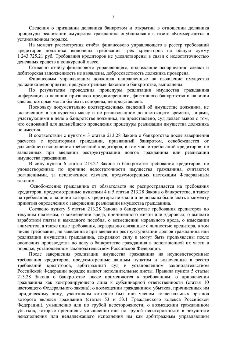 - В реестр требований кредиторов включены требования на общую сумму 1 243 725 рублей.
