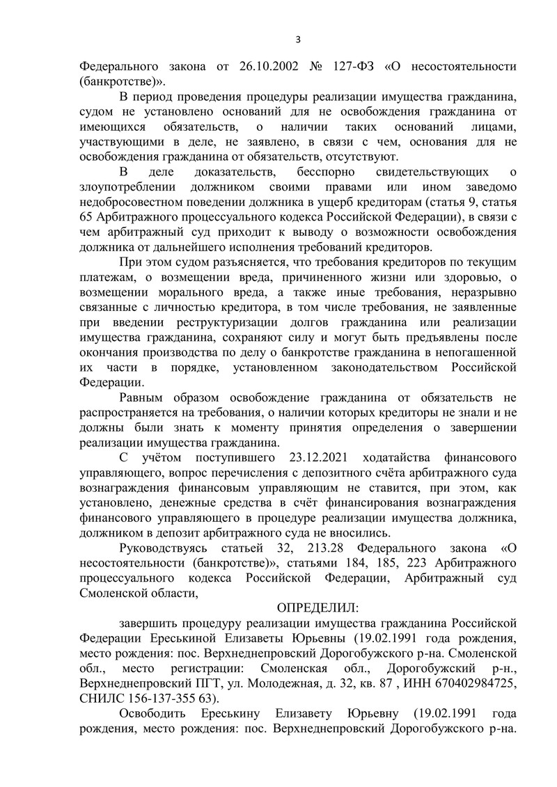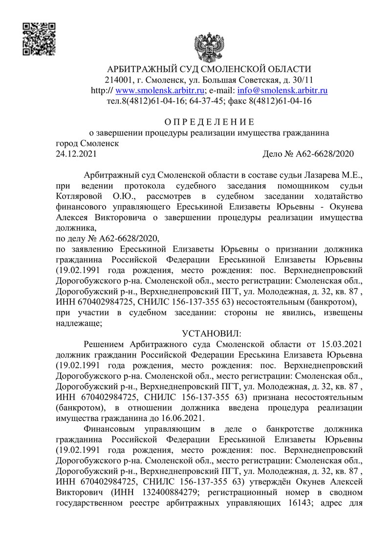 Дело №А62-6628/2020 о признании банкротом гражданина Российской Федерации завершилось 24 декабря 2021 года. Судья вынес определение в пользу нашего клиента.