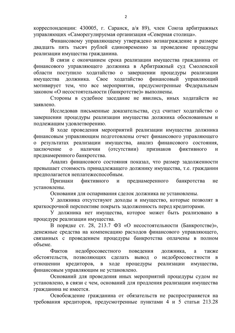 На основании всех вышеуказанных данных суд принял решение удовлетворить ходатайство о завершении процедуры реализации имущества. Наш клиент был освобожден от дальнейшего исполнения требований кредиторов, включая те, которые не были заявлены в процедуре.