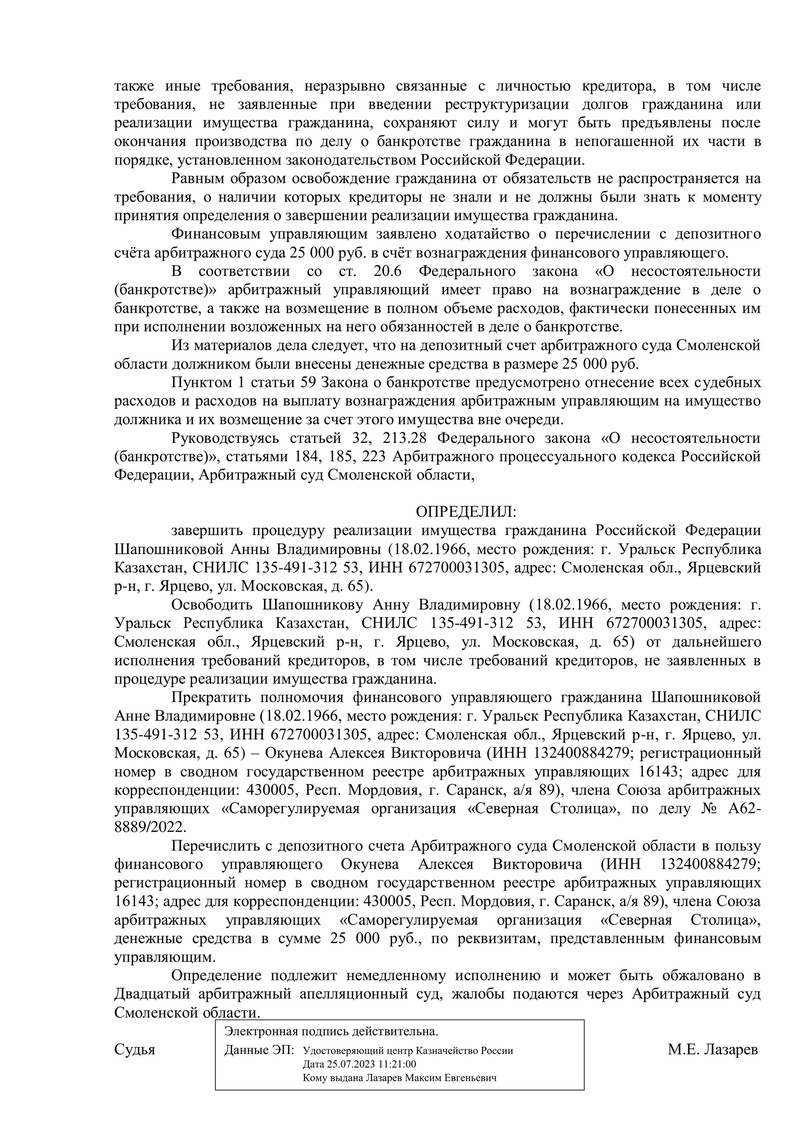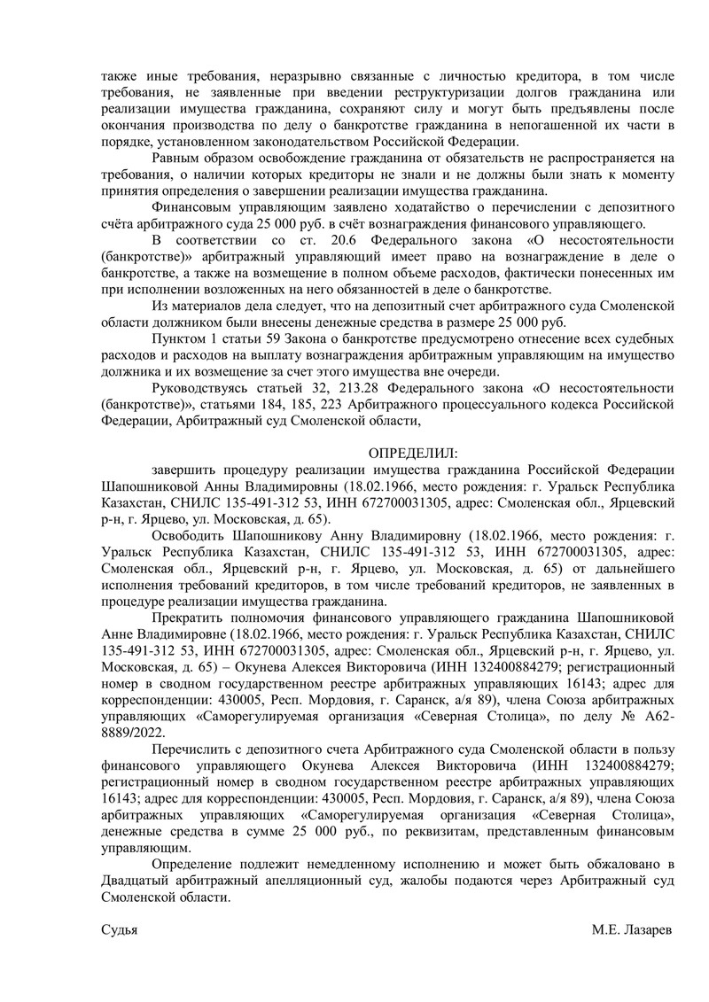 В этом деле, зарегистрированном под номером А62-8889/2022, судья рассмотрел ходатайство финансового управляющего о завершении процедуры реализации имущества нашего клиента.