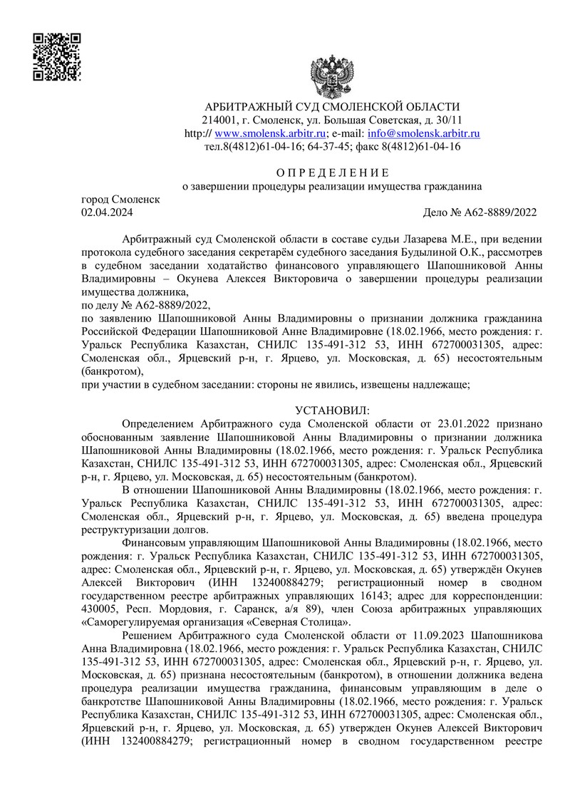 Мы рады сообщить об очередной победе нашего клиента! Арбитражный суд Смоленской области завершил процедуру реализации имущества должника, признав его банкротом и освободив от долговых обязательств.