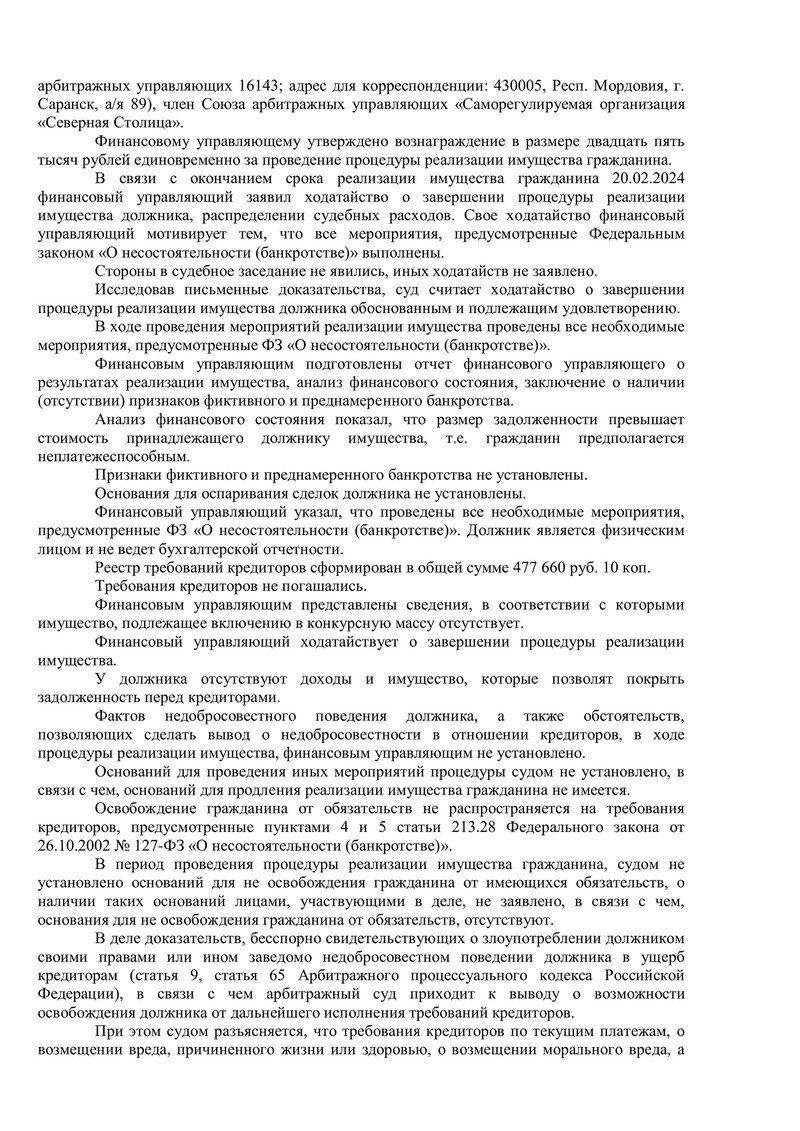 Ситуация клиента была непростой. Общая сумма долгов составляла 477 660 рублей 10 копеек. После тщательного анализа финансового состояния и проведения всех необходимых мероприятий, предусмотренных Федеральным законом №127-ФЗ "О несостоятельности (банкротстве)", суд не выявил признаков фиктивного или преднамеренного банкротства.