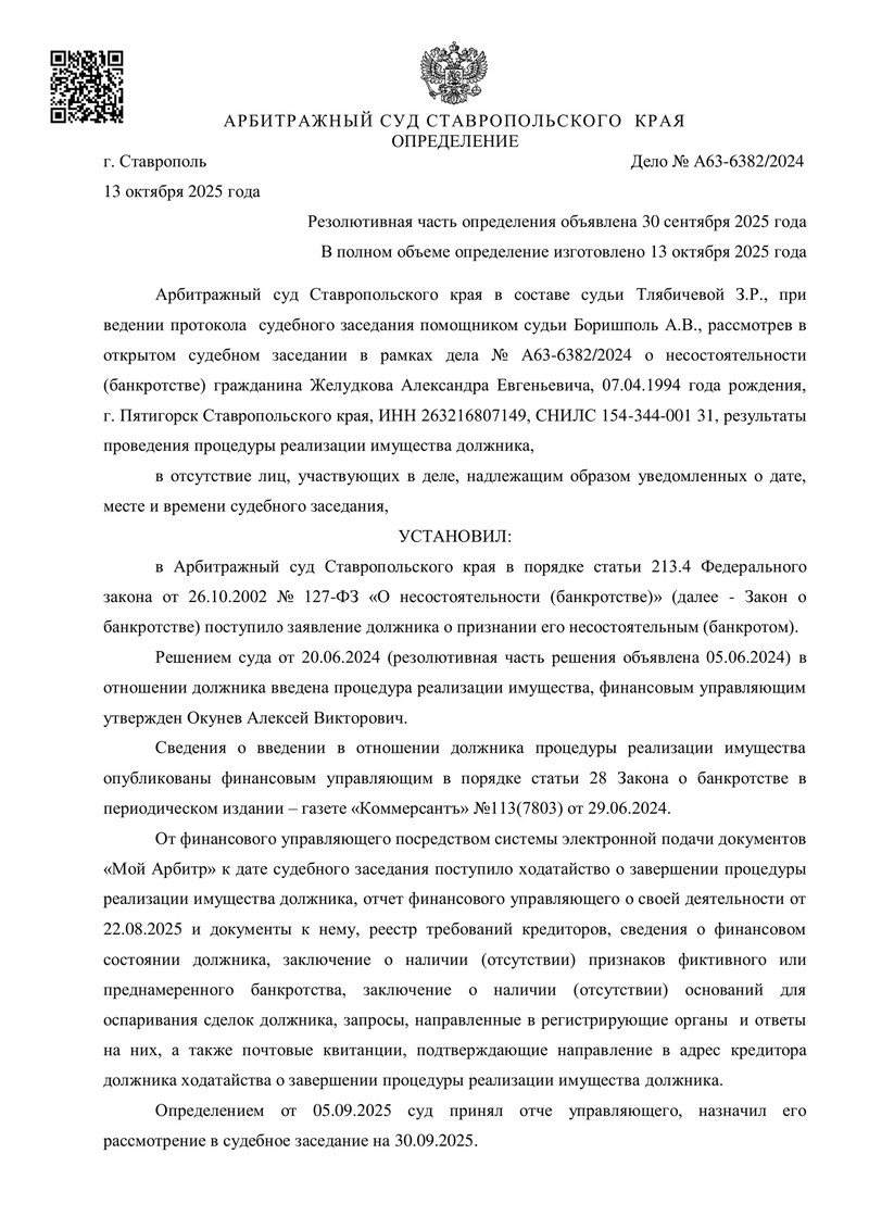 - Дата определения: 13 октября 2025 года (резолютивная часть — 30 сентября 2025 года)