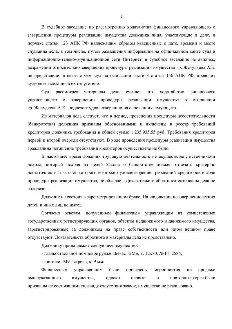 - К моменту рассмотрения отчёта по завершению процедуры у клиента отсутствовали источники дохода, имущества, за счёт которых можно было бы удовлетворить требования кредиторов, в материалах дела найдено не было.