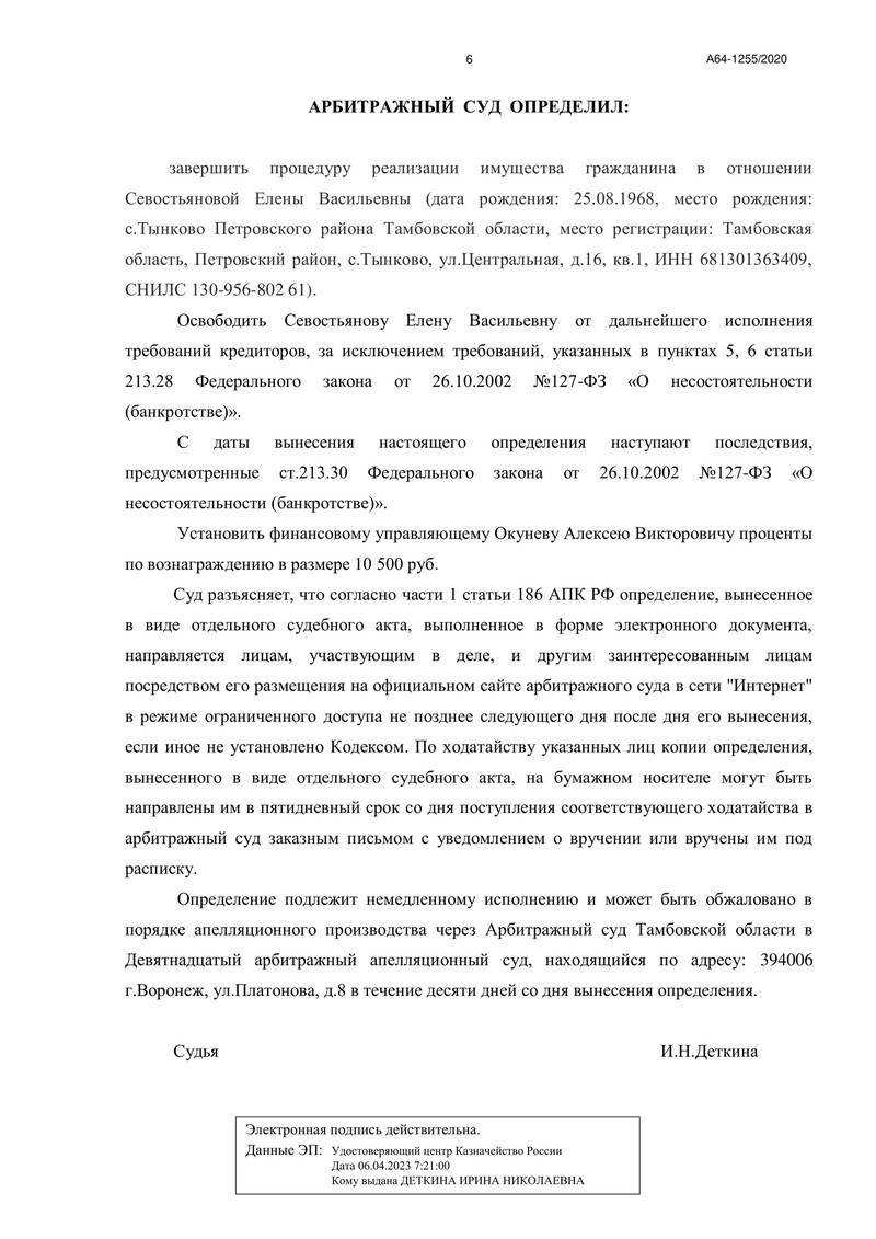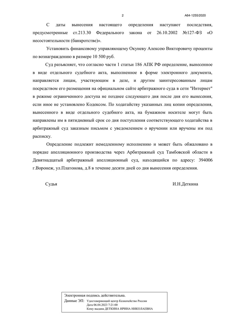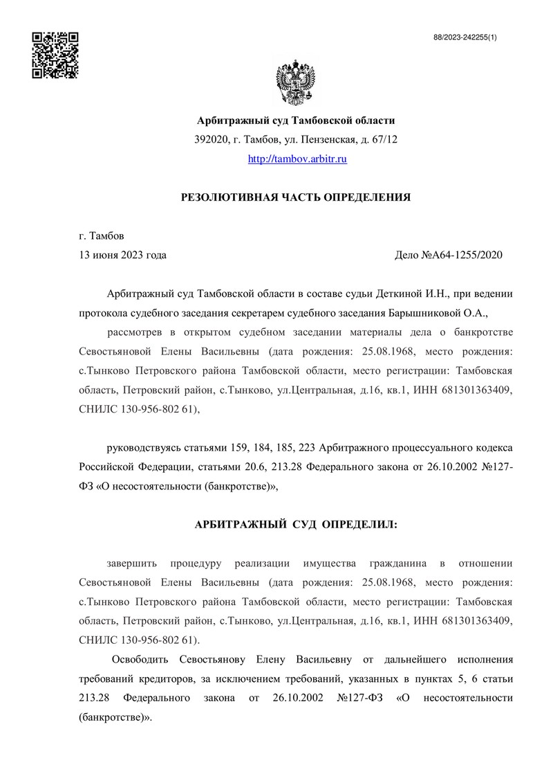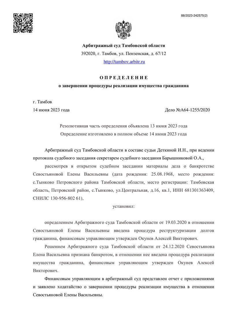 Компания "ДОЛГАМ.НЕТ" успешно завершила очередное банкротное дело и помогла тем самым своему клиенту справиться с задолженностью и избавиться от финансовой кабалы. 14 июня 2023 года Арбитражный суд Тамбовской области вынес определение о завершении процедуры реализации имущества гражданина. Это решение является важным этапом на пути к финансовому оздоровлению и свободе нашего клиента.