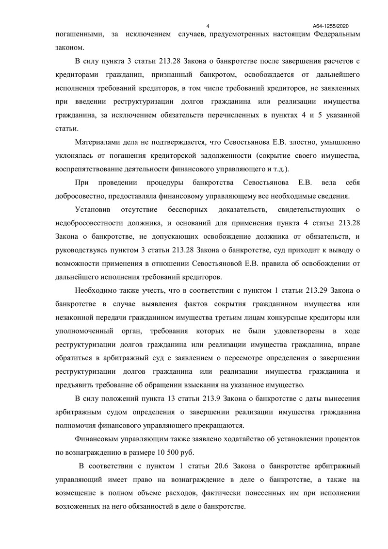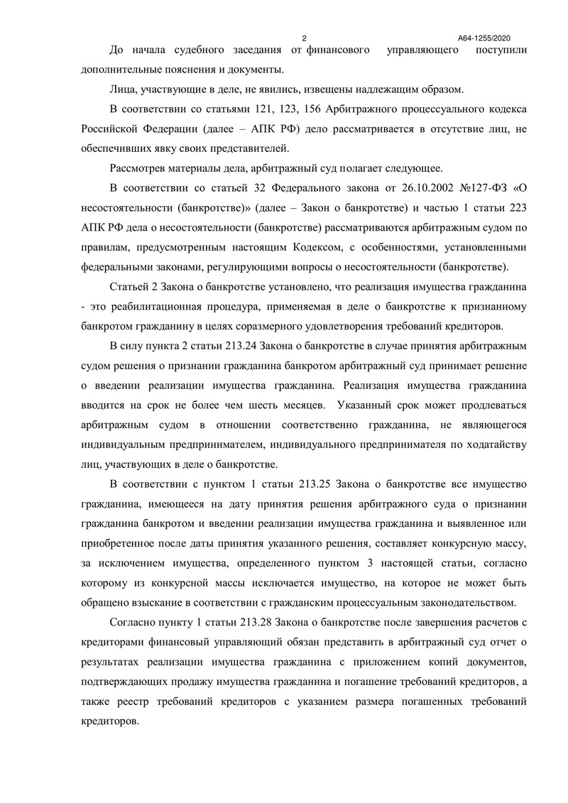 Арбитражный суд установил отсутствие недобросовестного поведения со стороны должника и принял решение завершить процедуру реализации имущества. Это позволило освободить нашего клиента от дальнейшего исполнения требований кредиторов, за исключением случаев, предусмотренных законом.