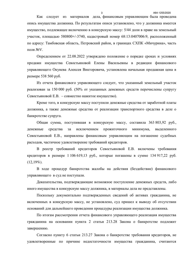 В реестр требований кредиторов были включены требования на сумму 1 106 619 рублей, из которых погашено удалось погасить 134 917 рублей (12,19%). За время проведения процедуры жалобы на действия финансового управляющего не поступали, что свидетельствует о качестве и прозрачности проведенной им работы.