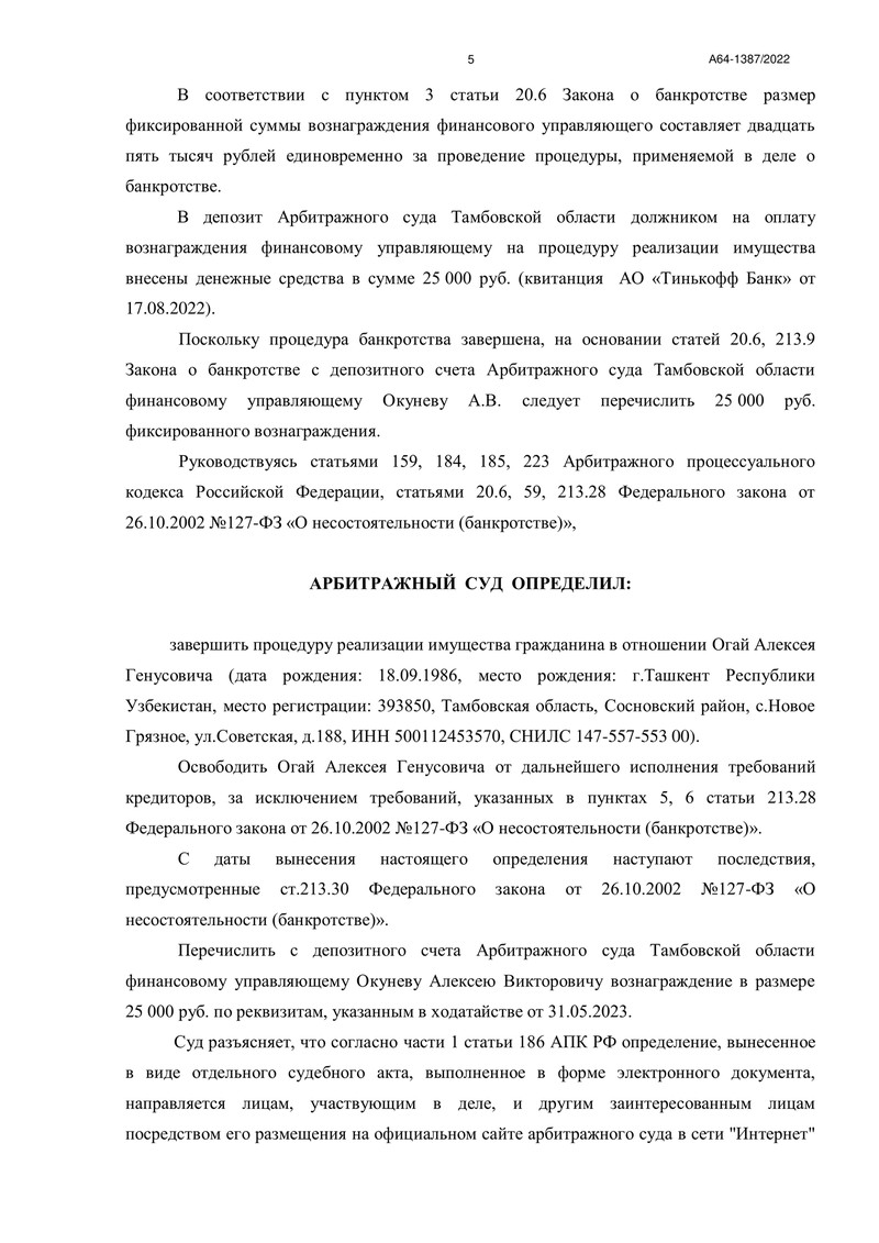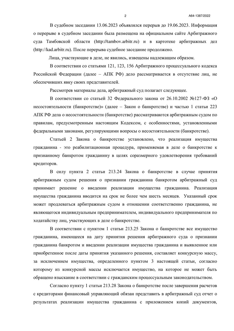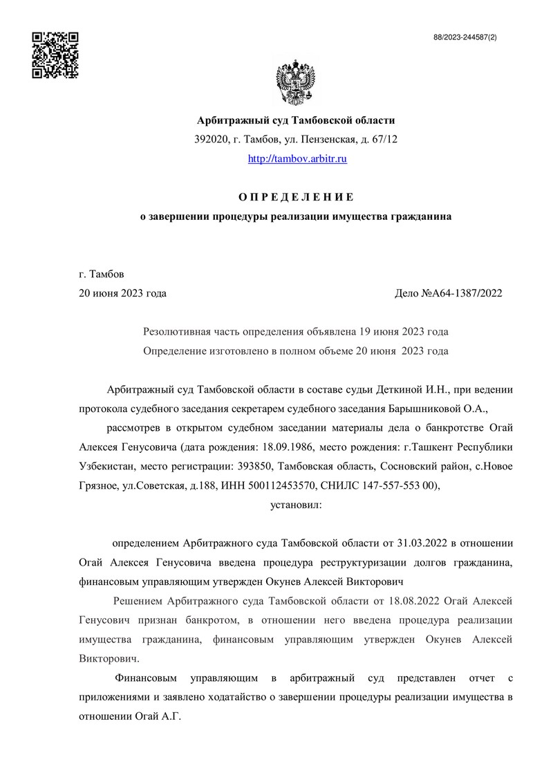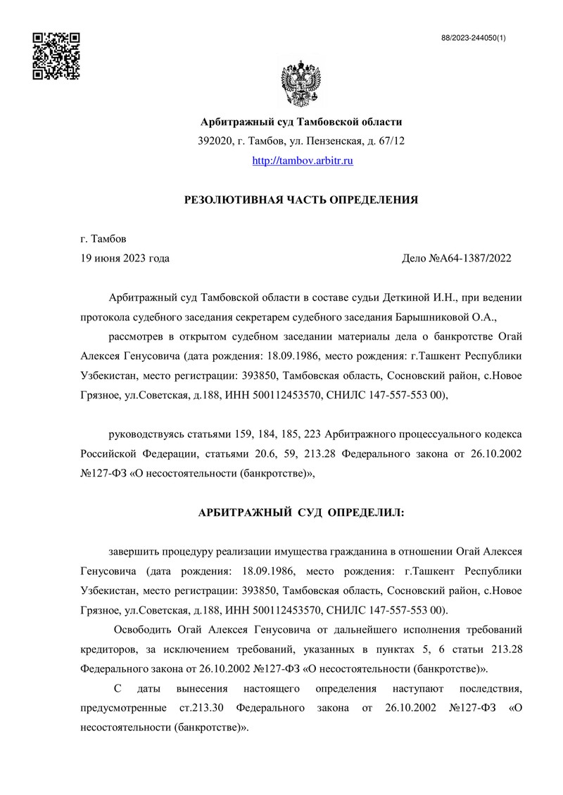 20 июня 2023 года стало знаменательной датой для клиента компании "ДОЛГАМ.НЕТ". Арбитражный суд Тамбовской области завершил процедуру реализации имущества гражданина по делу №А64-1387/2022, тем самым освободив его от дальнейших долговых обязательств перед кредиторами.