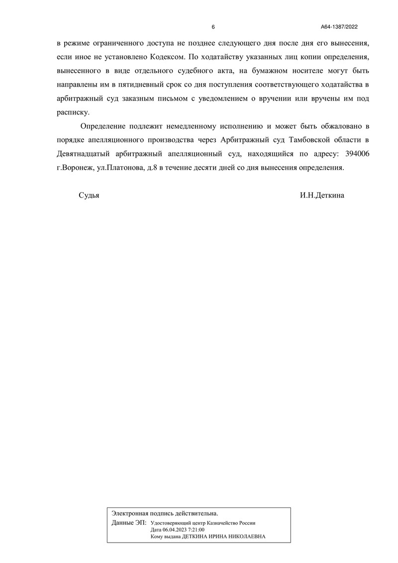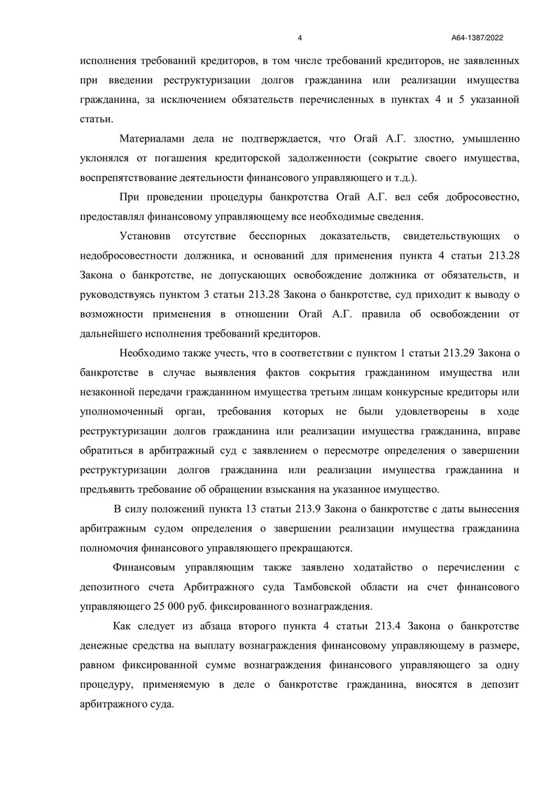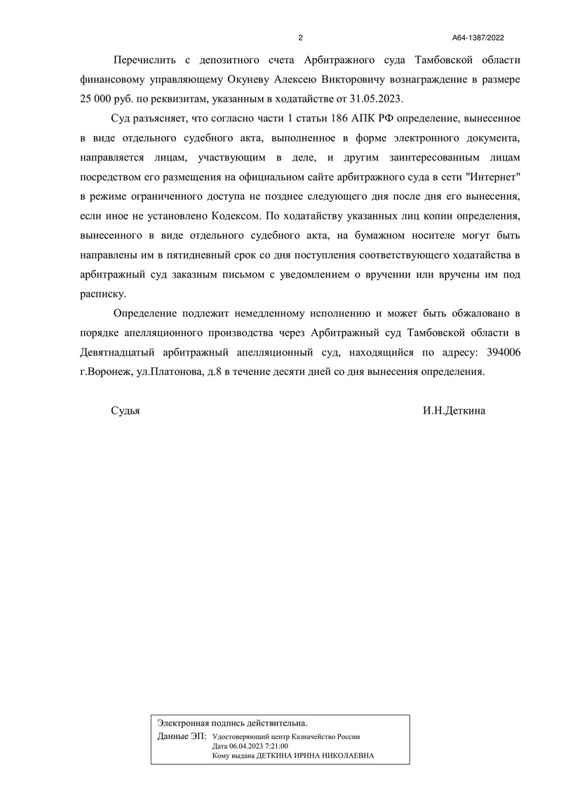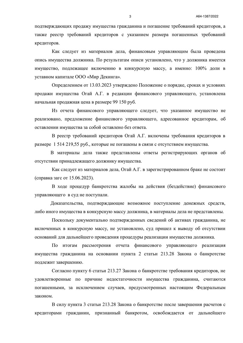 20 июня 2023 года стало знаменательной датой для клиента компании "ДОЛГАМ.НЕТ". Арбитражный суд Тамбовской области завершил процедуру реализации имущества гражданина по делу №А64-1387/2022, тем самым освободив его от дальнейших долговых обязательств перед кредиторами.