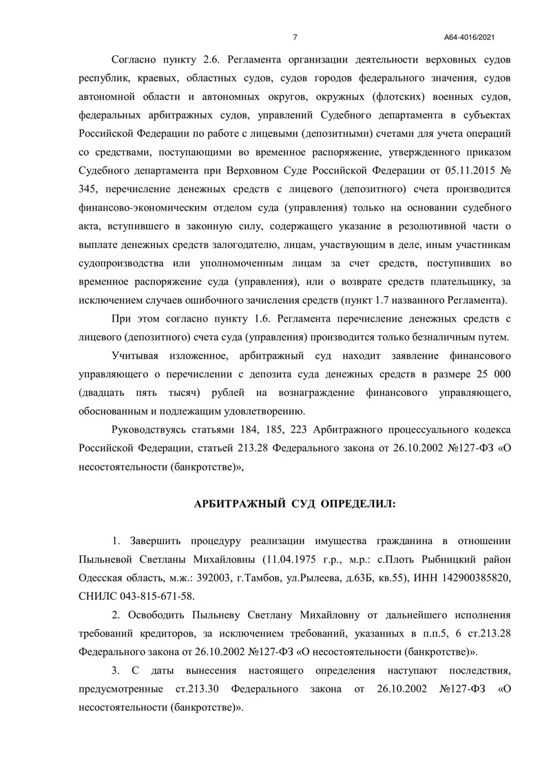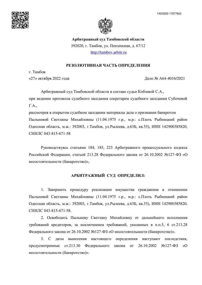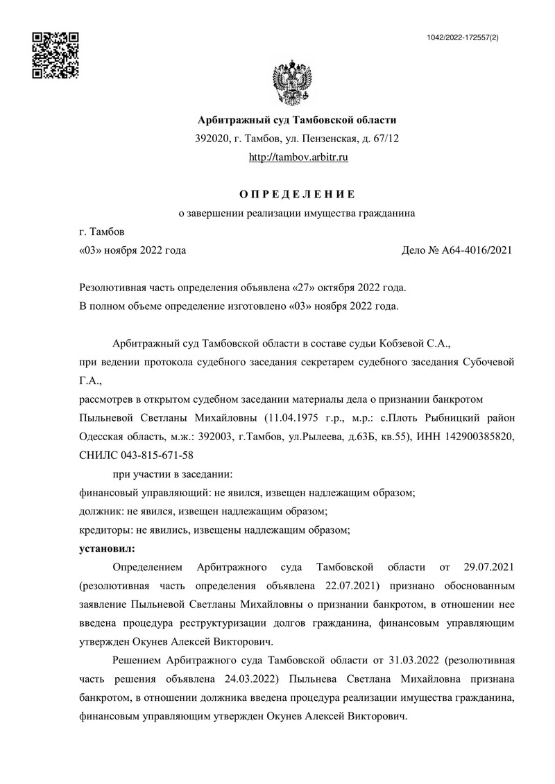 3 ноября 2022 года Арбитражный суд Тамбовской области завершил процедуру реализации имущества, освободив нашего клиента от дальнейшего исполнения требований кредиторов.