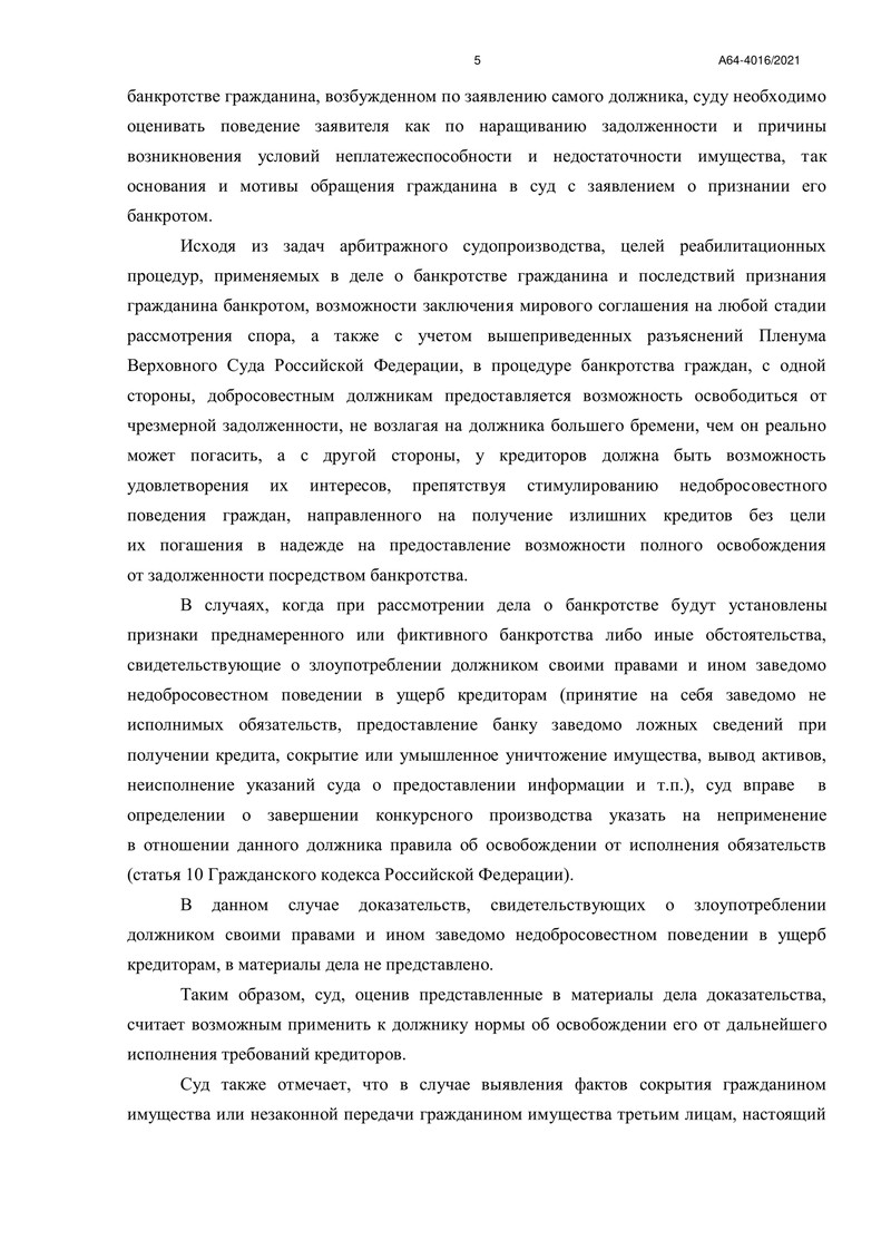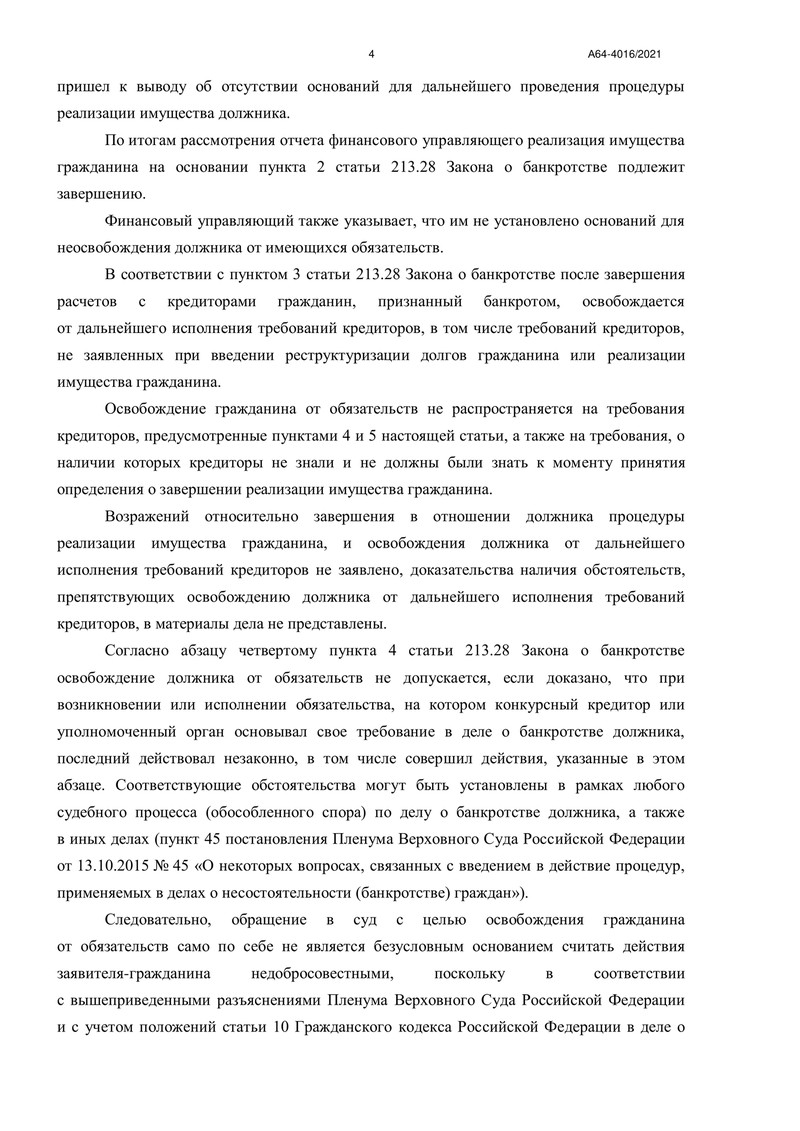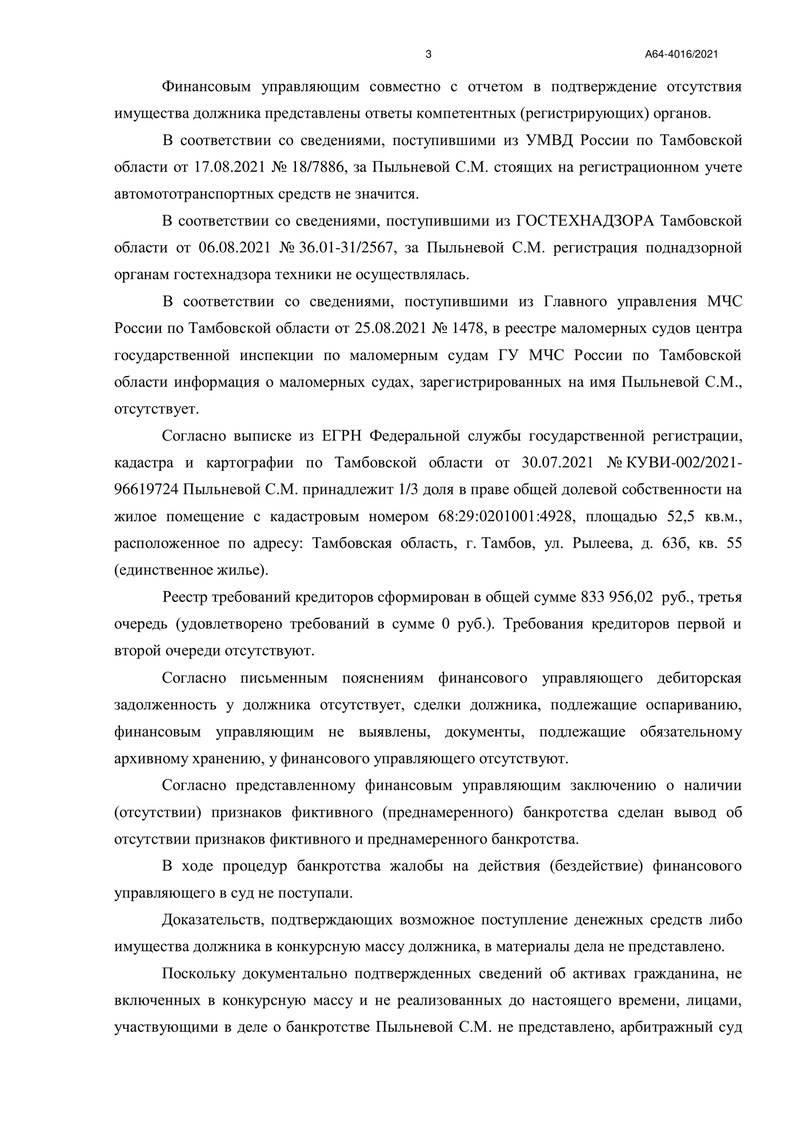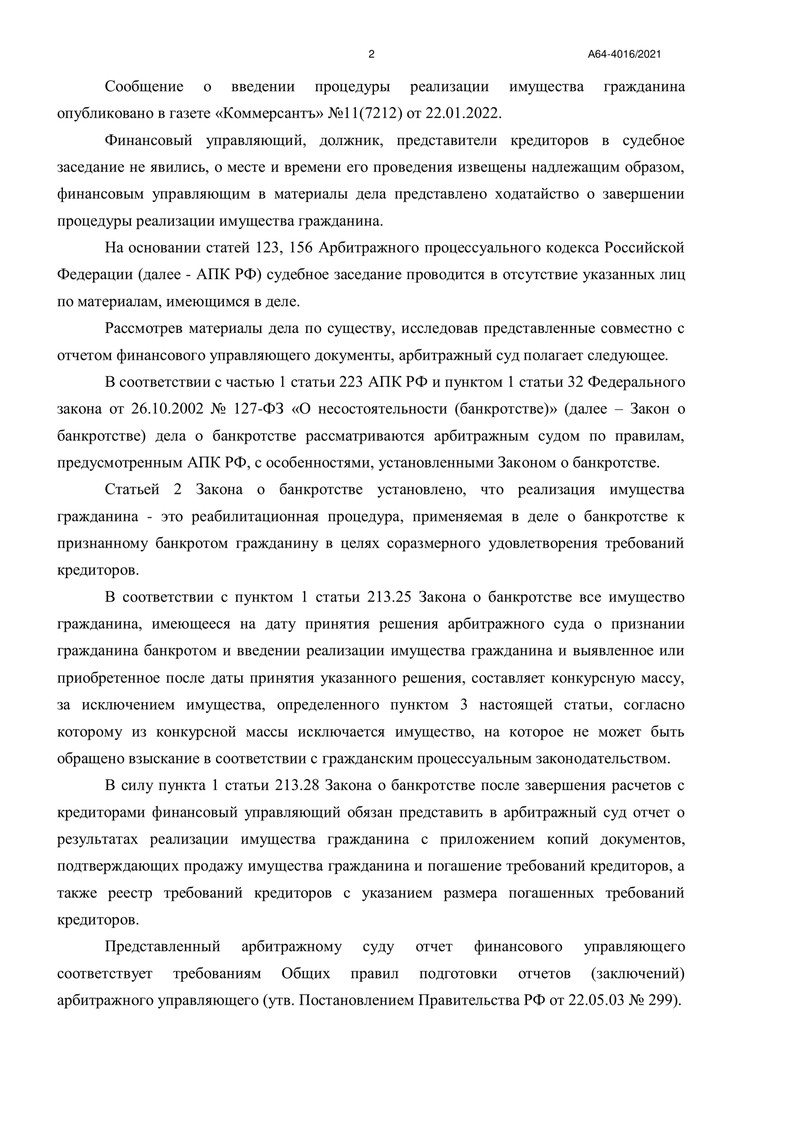 Процедура реализации имущества длилась с 31 марта 2022 года. Финансовый управляющий собрал все необходимые сведения и представил арбитражному суду отчет, который подтвердил отсутствие активов, подлежащих реализации.