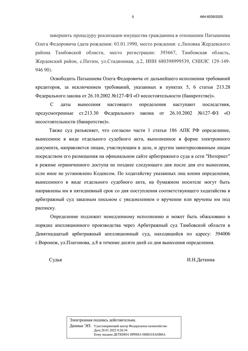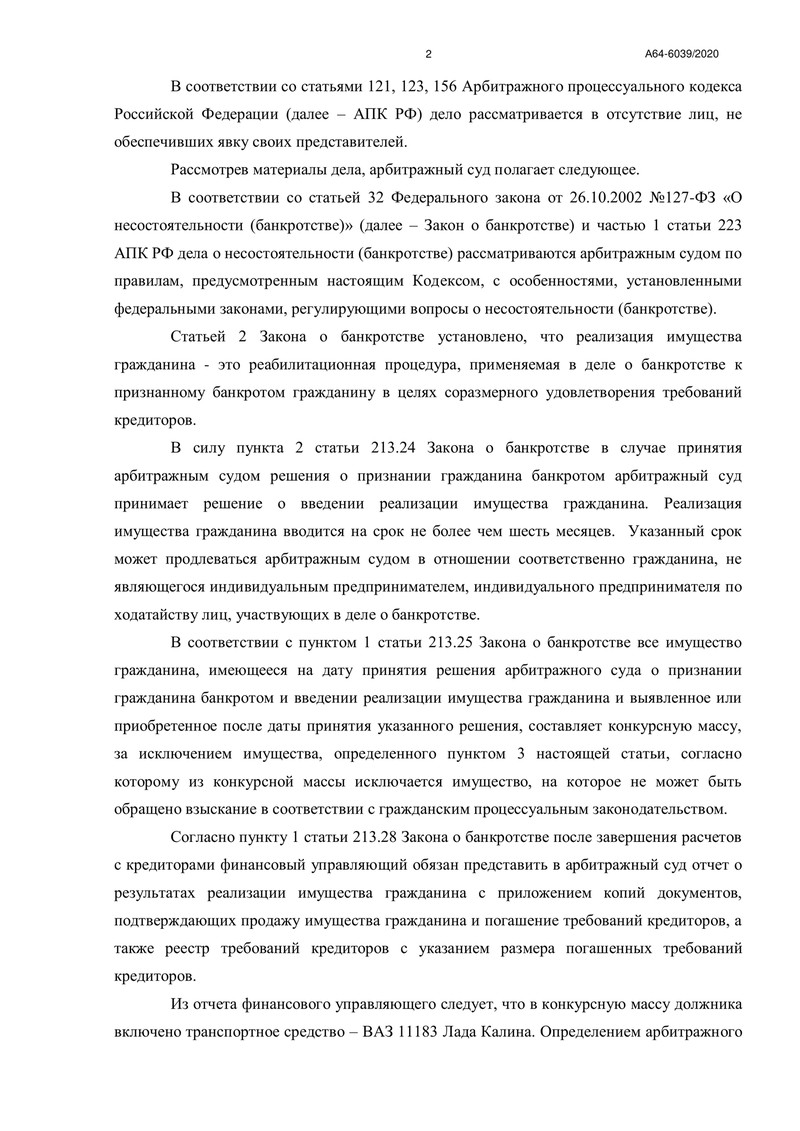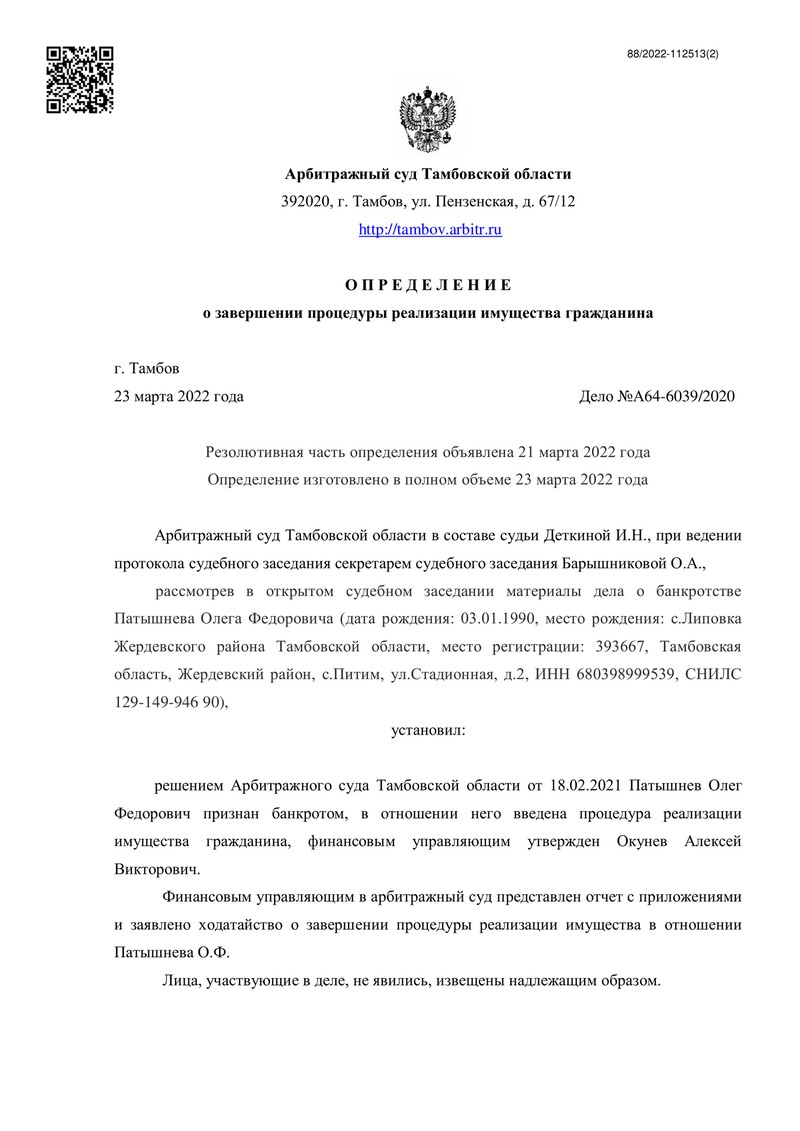23 марта 2022 года Арбитражный суд Тамбовской области завершил дело №А64-6039/2020 о банкротстве клиента компании "ДОЛГАМ.НЕТ".