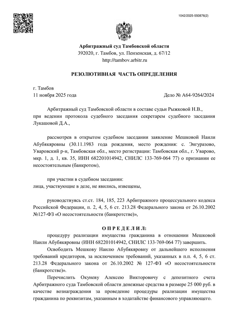 11 ноября 2025 года Арбитражный суд Тамбовской области официально завершил процедуру банкротства в деле №А64-9264/2024. Определение суда освободило нашего клиента от дальнейшего исполнения долговых обязательств перед кредиторами. Данный случай представляет собой яркий пример успешной работы специалистов компании "ДОЛГАМ.НЕТ" и эффективной защиты интересов должника.