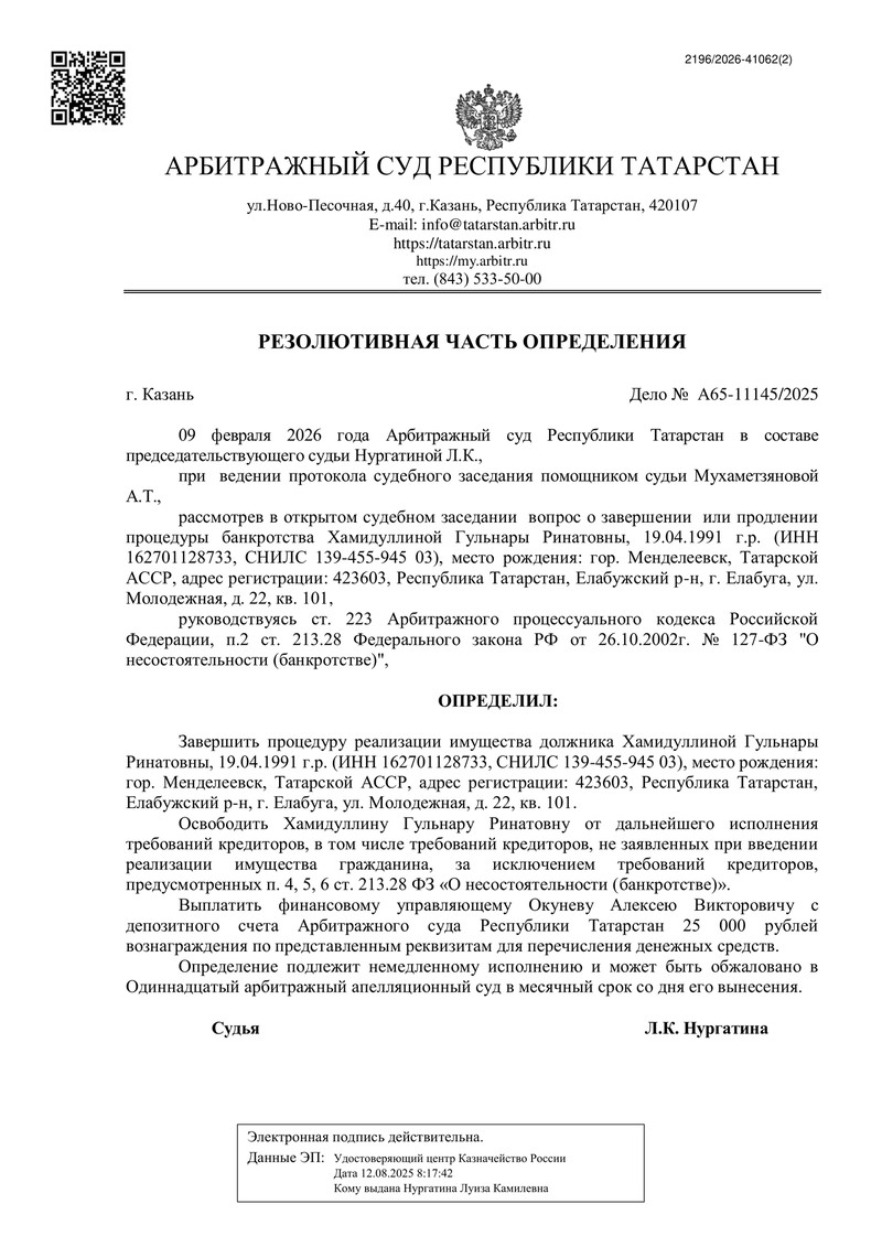 Дело № А65-11145/2025: банкротство физического лица в Республике Татарстан успешно завершено