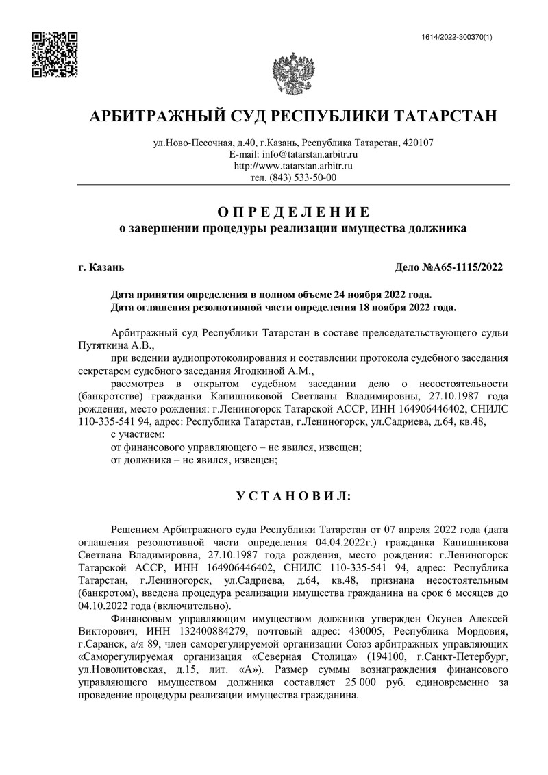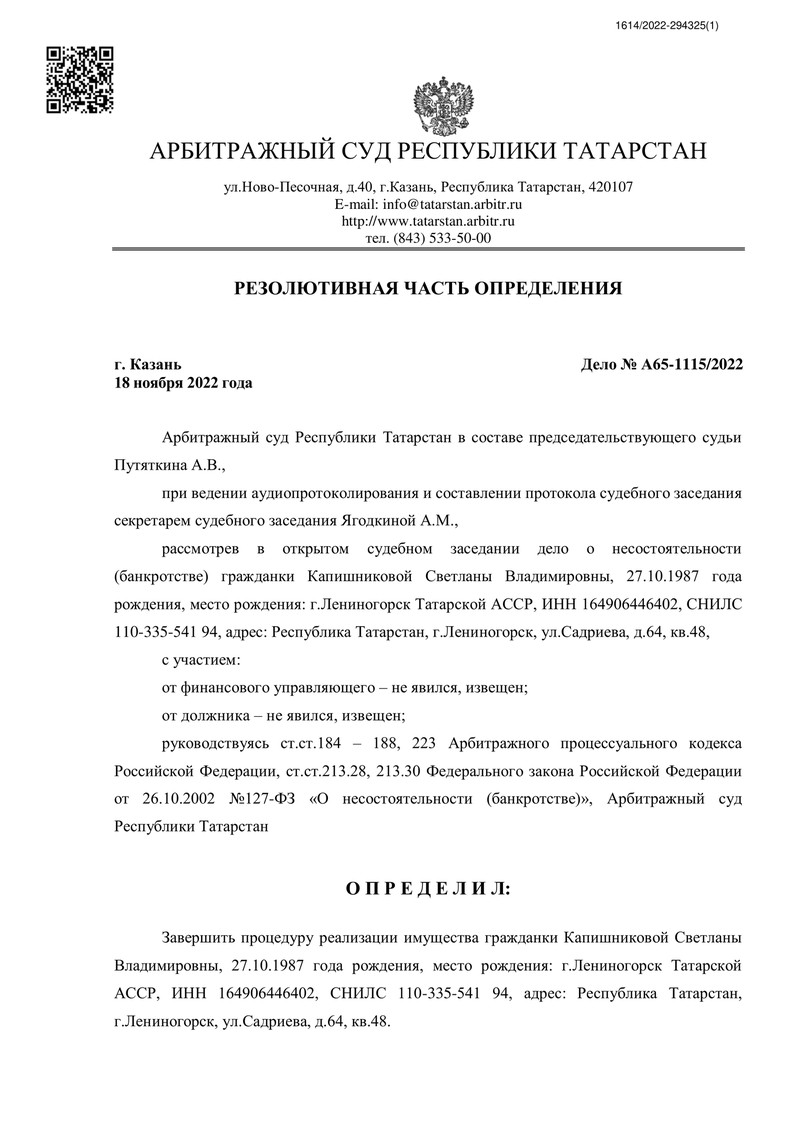 Мы рады сообщить об очередном успешном деле компании "ДОЛГАМ.НЕТ"! Арбитражный суд Республики Татарстан завершил процедуру реализации имущества нашей клиентки, проживающей в городе Лениногорск.